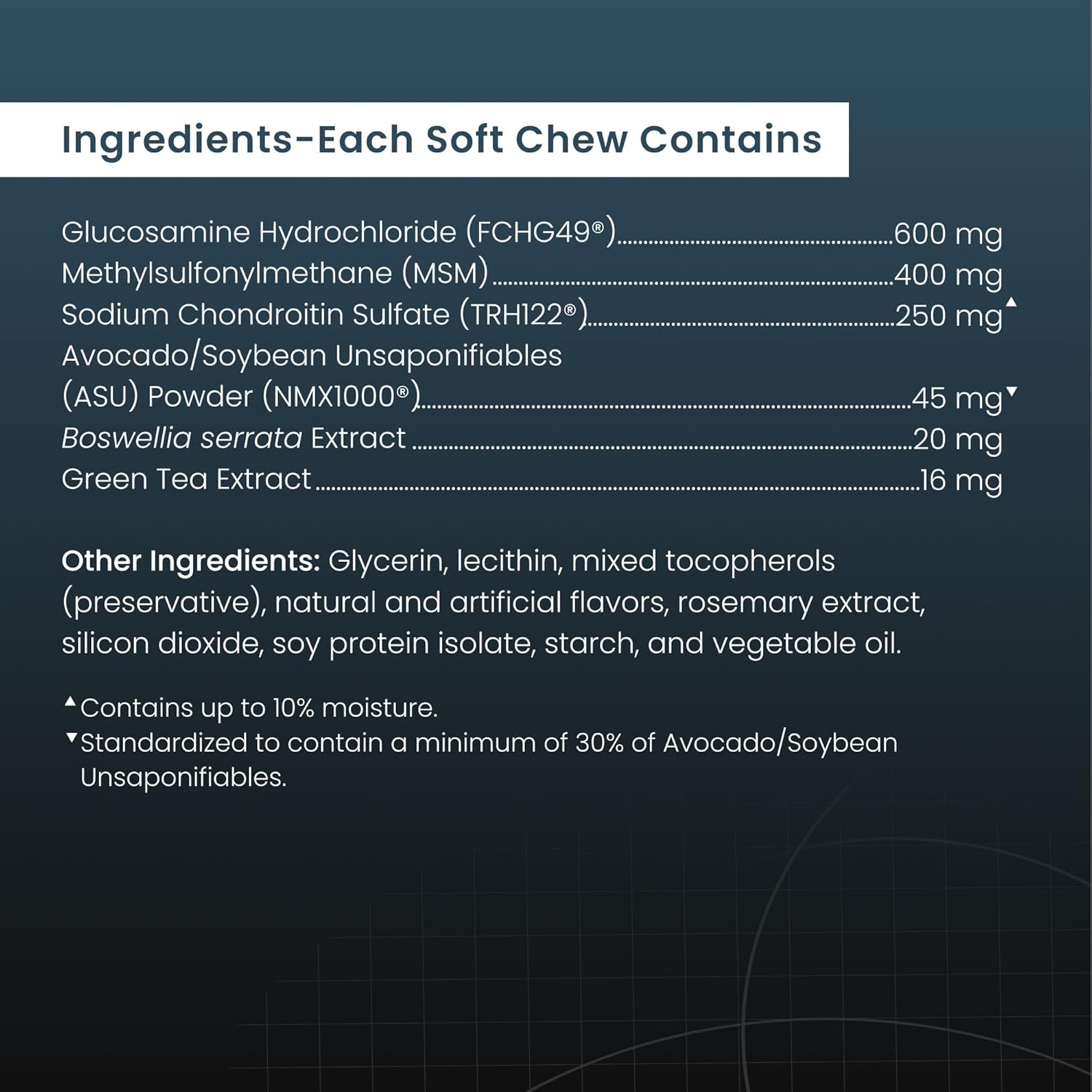 - Patented Formula - With a unique combination that contains glucosamine hydrochloride (FCHG49), sodium chondroitin sulfate (TRH122), ASU (NMX1000), methylsulfonylmethane (MSM), Boswellia serrata extract, and green tea extract, Dasuquin helps support your dog’s joint health.