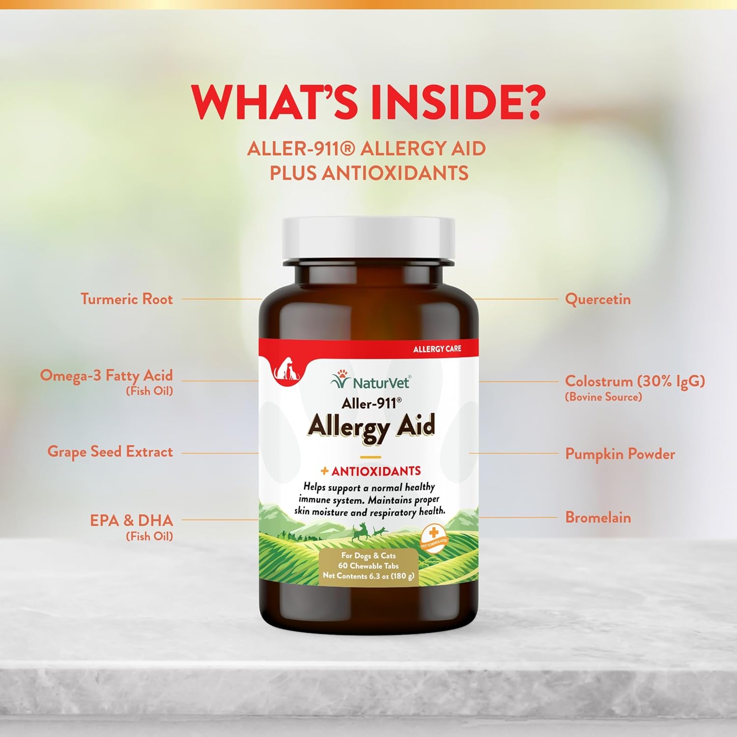 - HIGH-QUALITY ALLERGY SUPPLEMENT FOR DOGS, CATS: Help your furry friend weather the changes in season with this NaturVet Aller-011 Advanced Allergy Aid for Dogs and Cats. This pet supplement is rich in antioxidants, omegas, DHA and EPA to help boost your pet’s immune system.