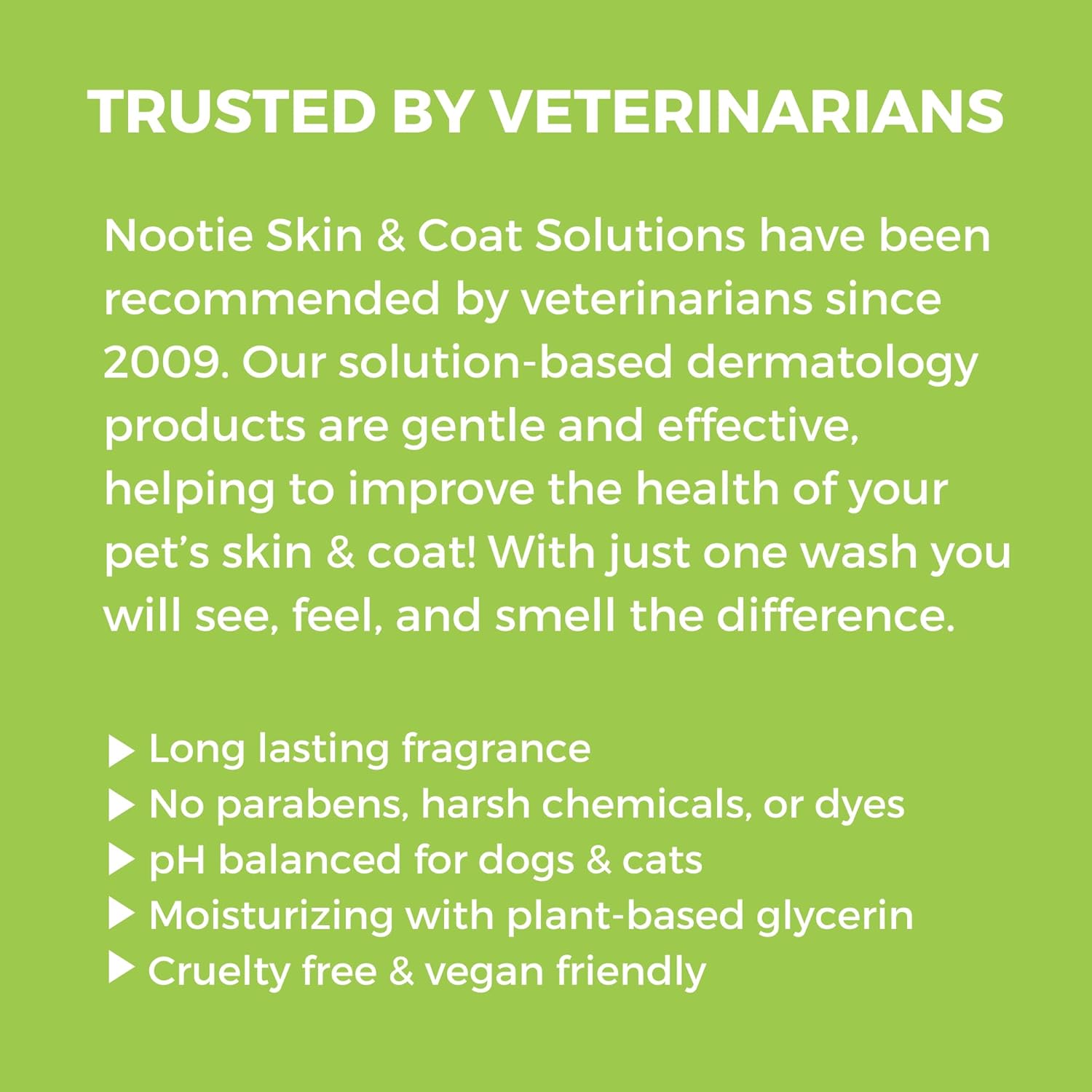 - NO PARABENS, CRUELTY-FREE & VEGAN FRIENDLY: Nootie products are always cruelty free and vegan friendly. This dog shampoo is free from any parabens, SLS, harsh chemicals, or dyes. It is pH balanced for dogs and cats.
