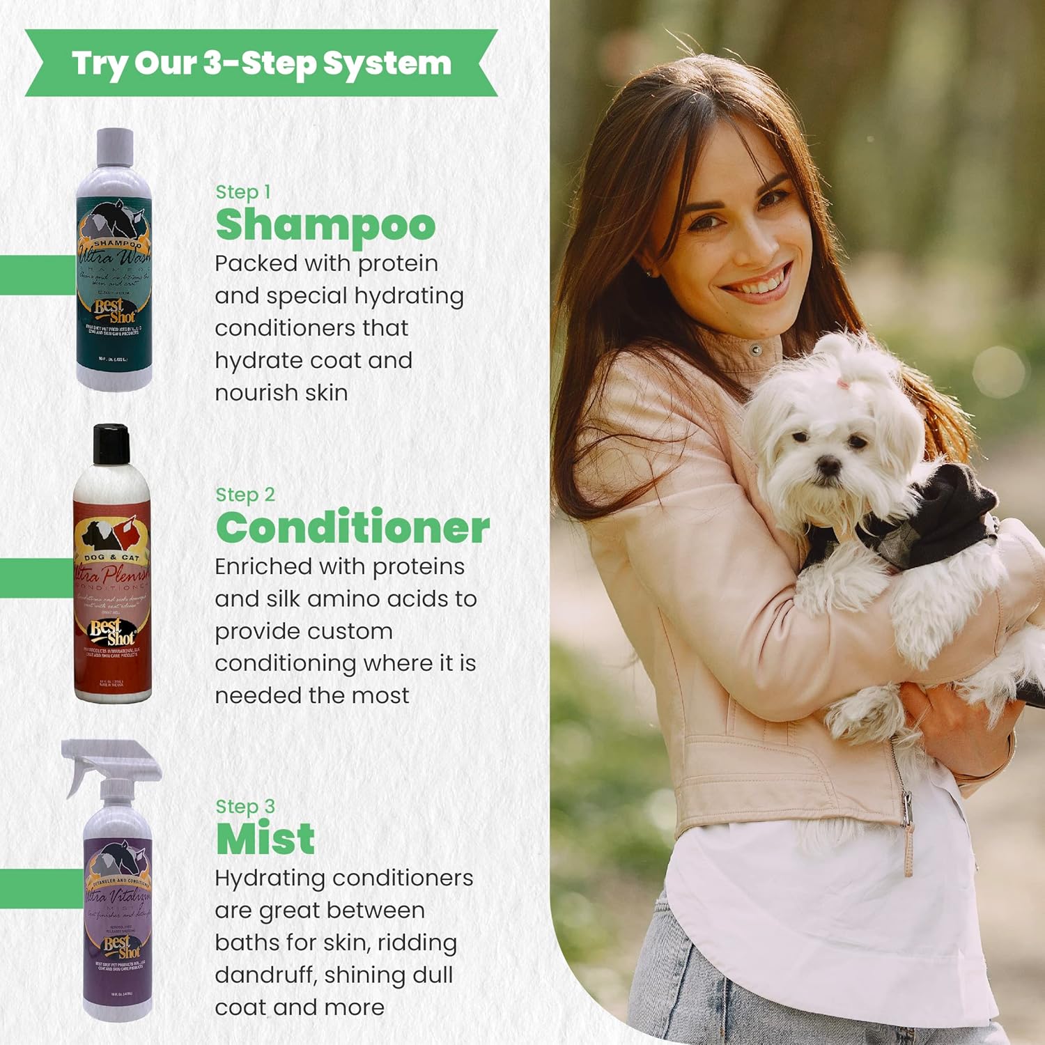 - Hypoallergenic: Alcohol-free and hypoallergenic, Best Shot’s Ultra-Vitalizing Mist detangling conditioner can be used for reducing malodor between baths, for routine brush-ups, or before drying to release more undercoat. Available in a 16 oz bottle