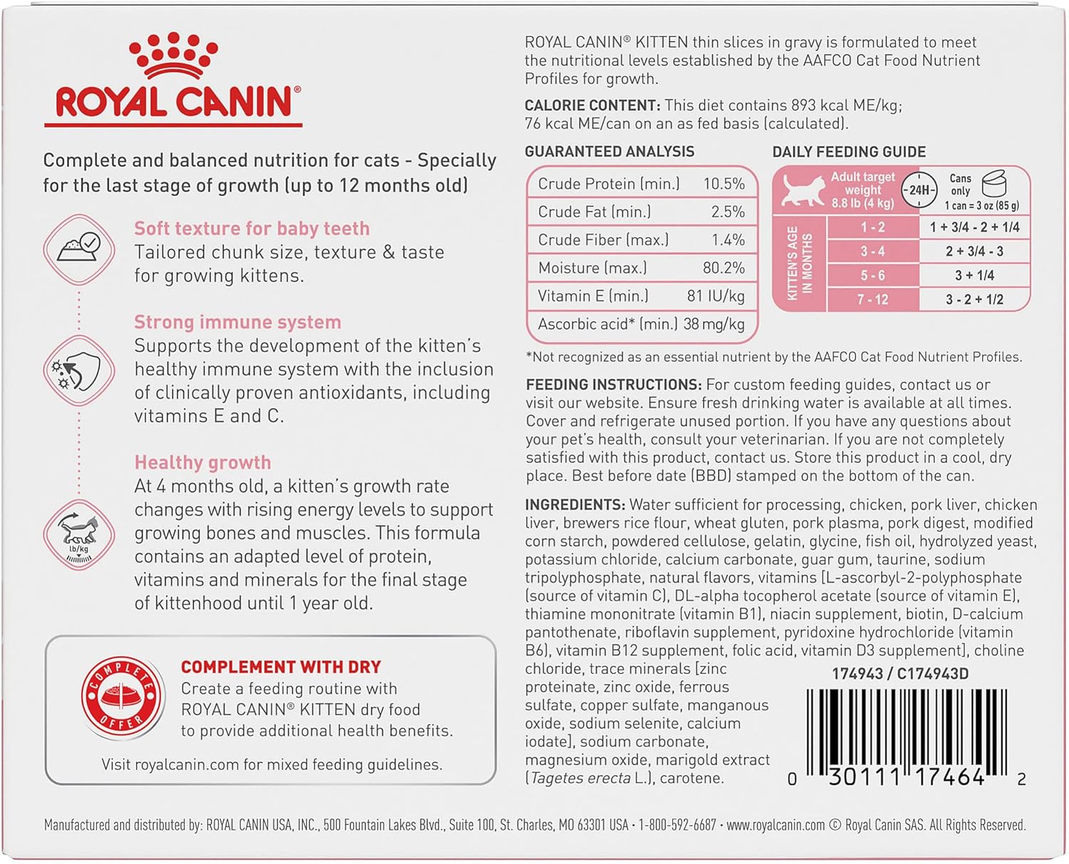 - FORMULATED FOR KITTENS: Royal Canin Kitten Thin Slices in Gravy Wet Cat Food is specifically formulated for kittens up to 12 months old; keeping them on this formula until they reach 12 months of age helps set up a healthy foundation for life