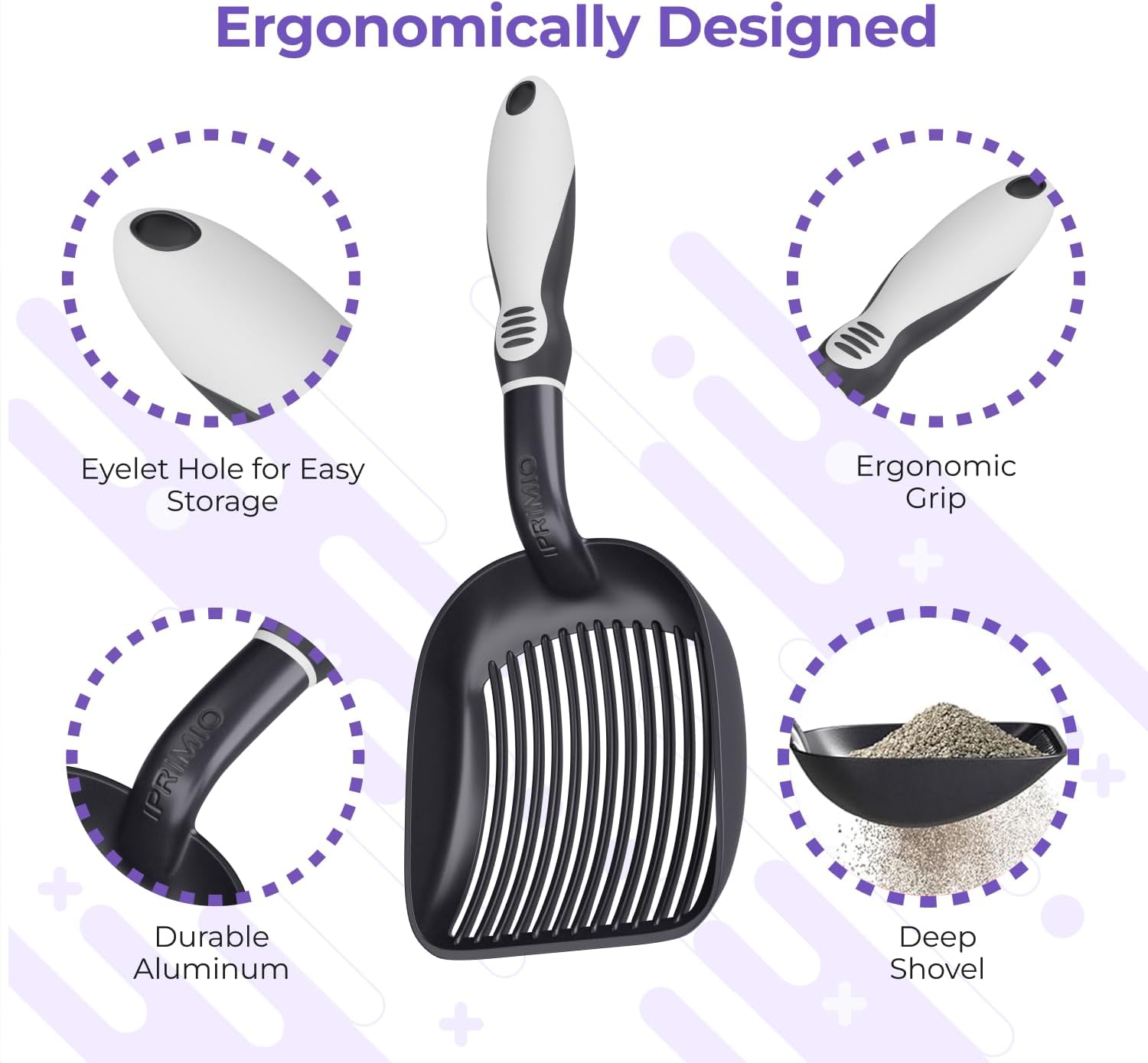 - Ergonomic Handle Design: The solid-core handle offers a comfortable grip, that helps lessen hand fatigue during use while ensuring the cat litter shovel remains durable and easy to maneuver