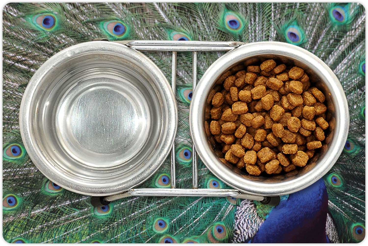 Lunarable Peacock Pet Mat for Food and Water, Peacock Displaying Elongated Majestic Feathers Open Wings Picture, Non-Slip Rubber Mat for Dogs and Cats, 18" X 12", Brown Navy