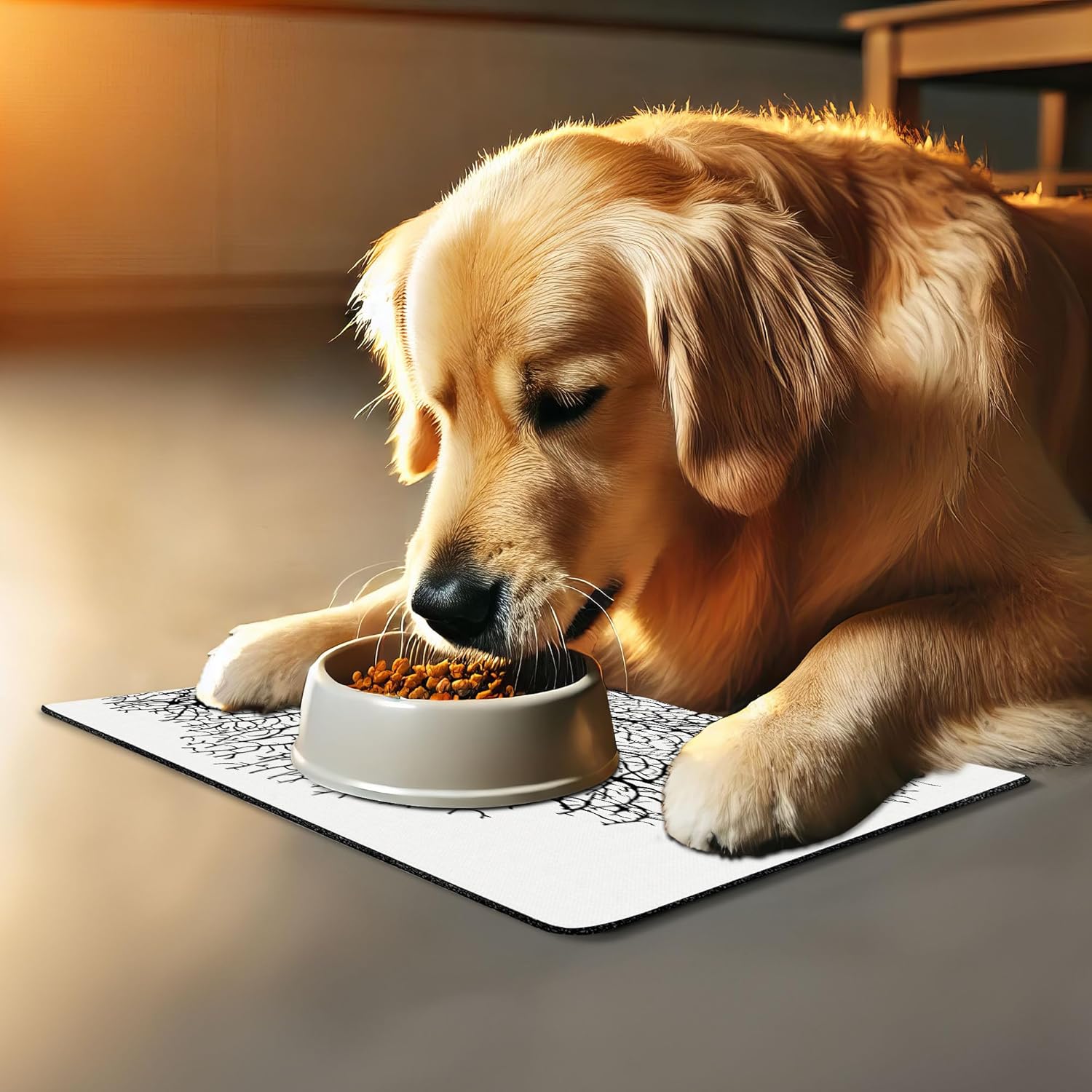 - Features - Fun prints and long-lasting colors. Find any theme and color you want to match your room decor or your pet’s personality. This pet feeding mat can even feature your cat's or dog’s favorite item or design, adding a cheerful touch to your pet’s feeding area.