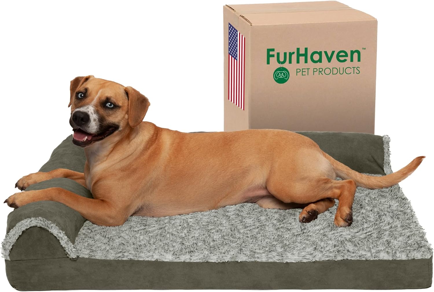 Furhaven Cooling Gel Dog Bed for Large/Medium Dogs w/ Removable Bolsters & Washable Cover, For Dogs Up to 55 lbs - Two-Tone Plush Faux Fur & Suede L Shaped Chaise - Dark Sage, Large