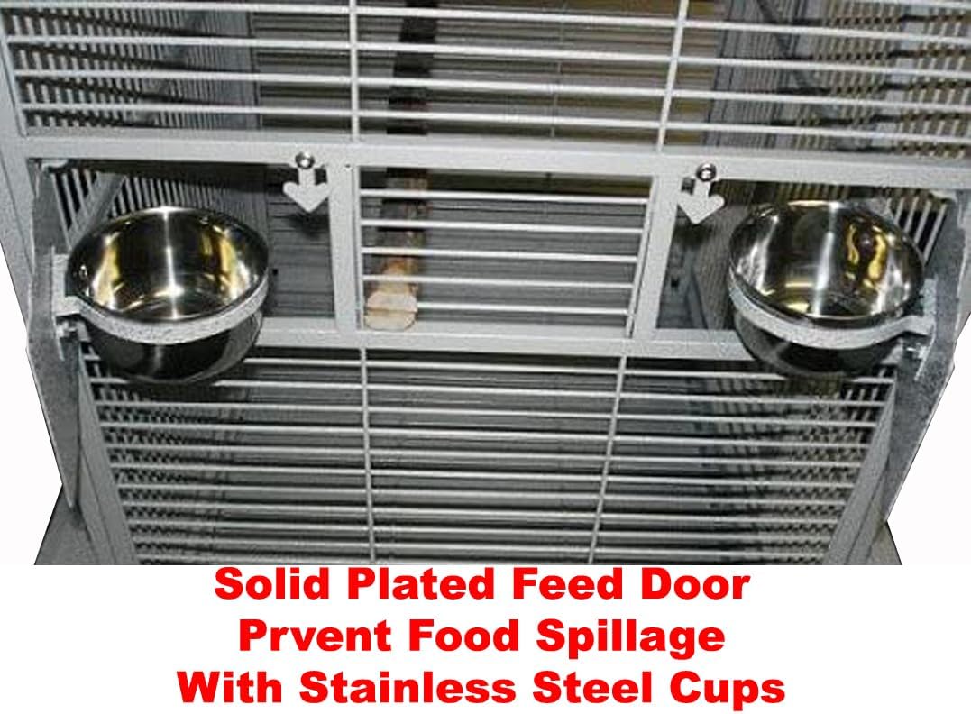 - 【Large Front Door】Size: 13.5 x 36.5H【Four Stainless Steel Cups】 With Swivel Solid Metal Plated feeder doors prevent spillage, Include One Side Top Breeding Solid Door. Inside Standing Natural Wooden Perch.