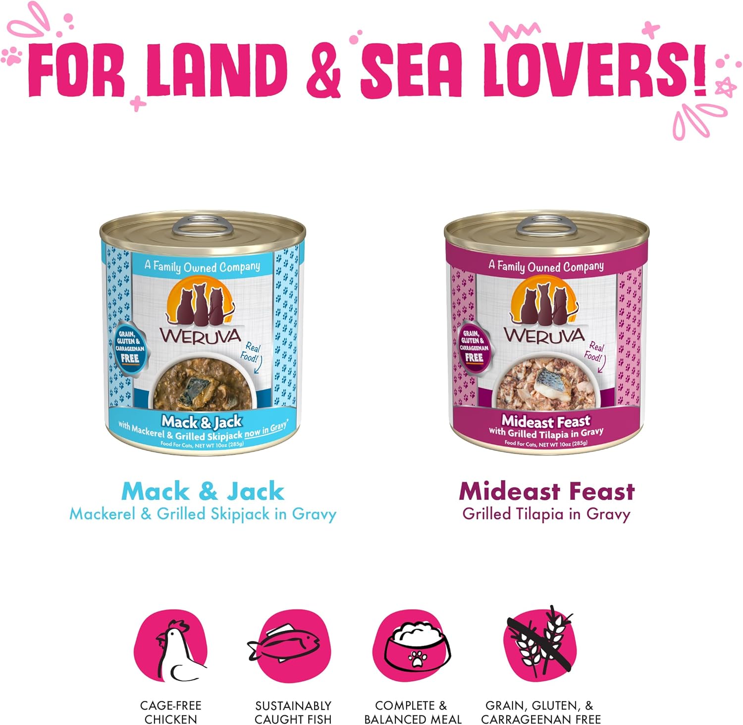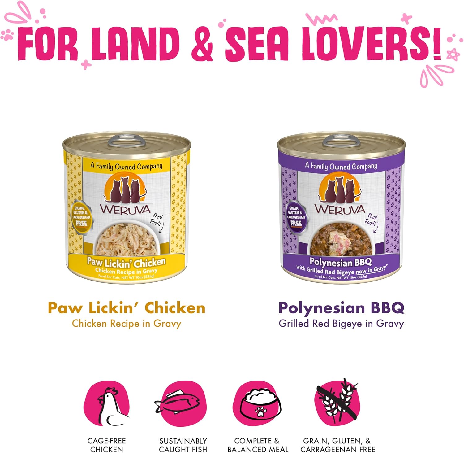- Wowzer Meowzer Variety Pack (10oz cans, Pack of 12) Our 4 most popular poultry and seafood recipes. Weruva’s official variety pack for multi-cat homes!