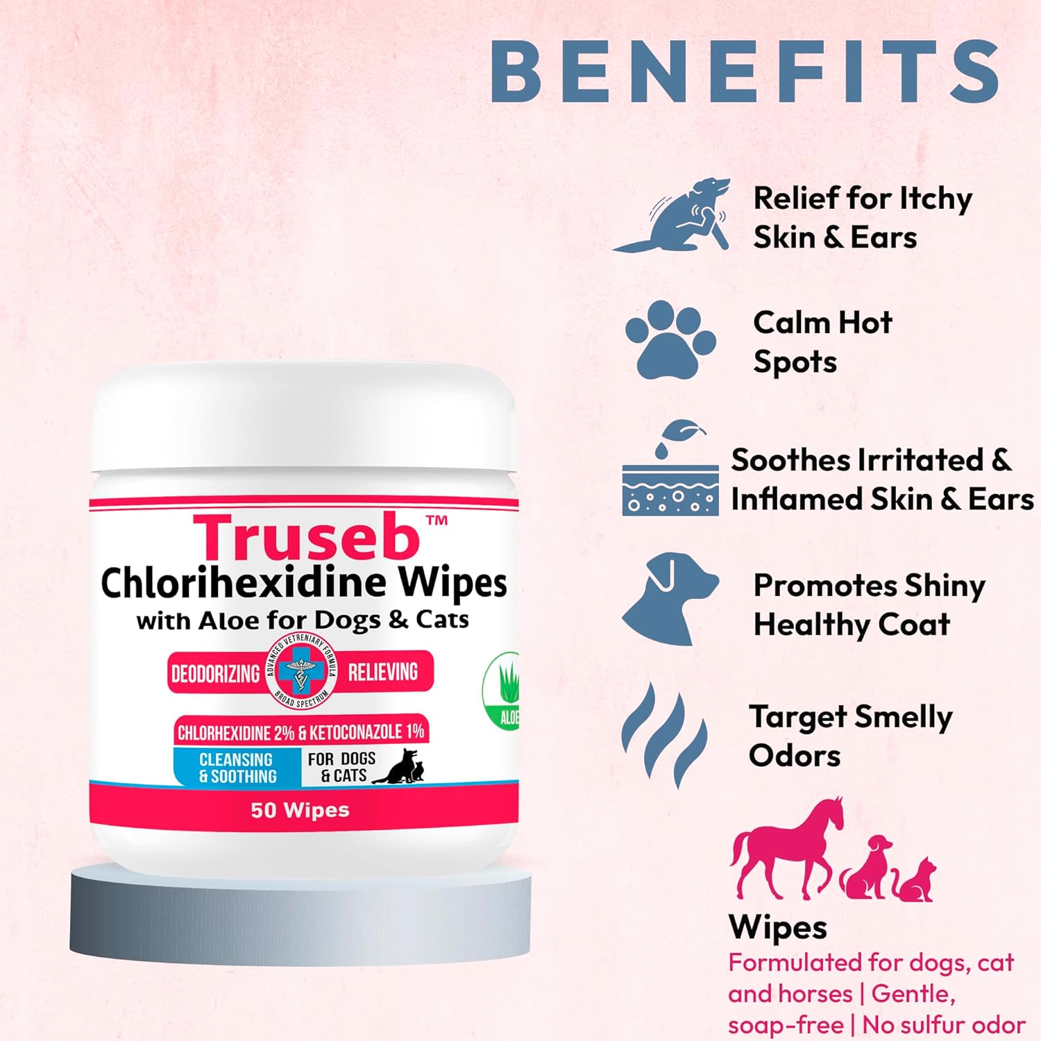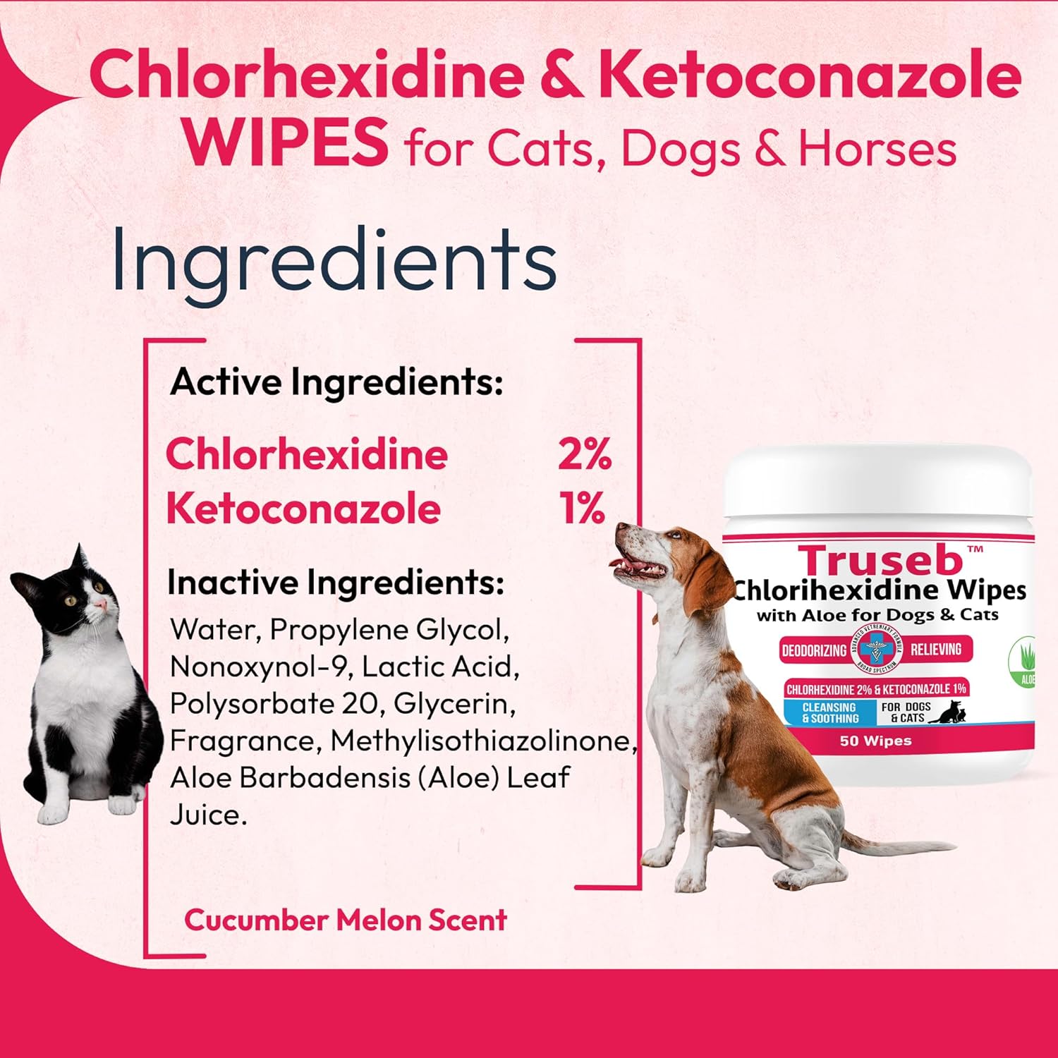 Truseb Topical Ketoconazole and Chlorhexidine Wipes for Dogs, Cats and Horses - with Aloe for Cleansing - 50 Count (Ketoconazole & Chlorhexidine Wipes, 50 Count)