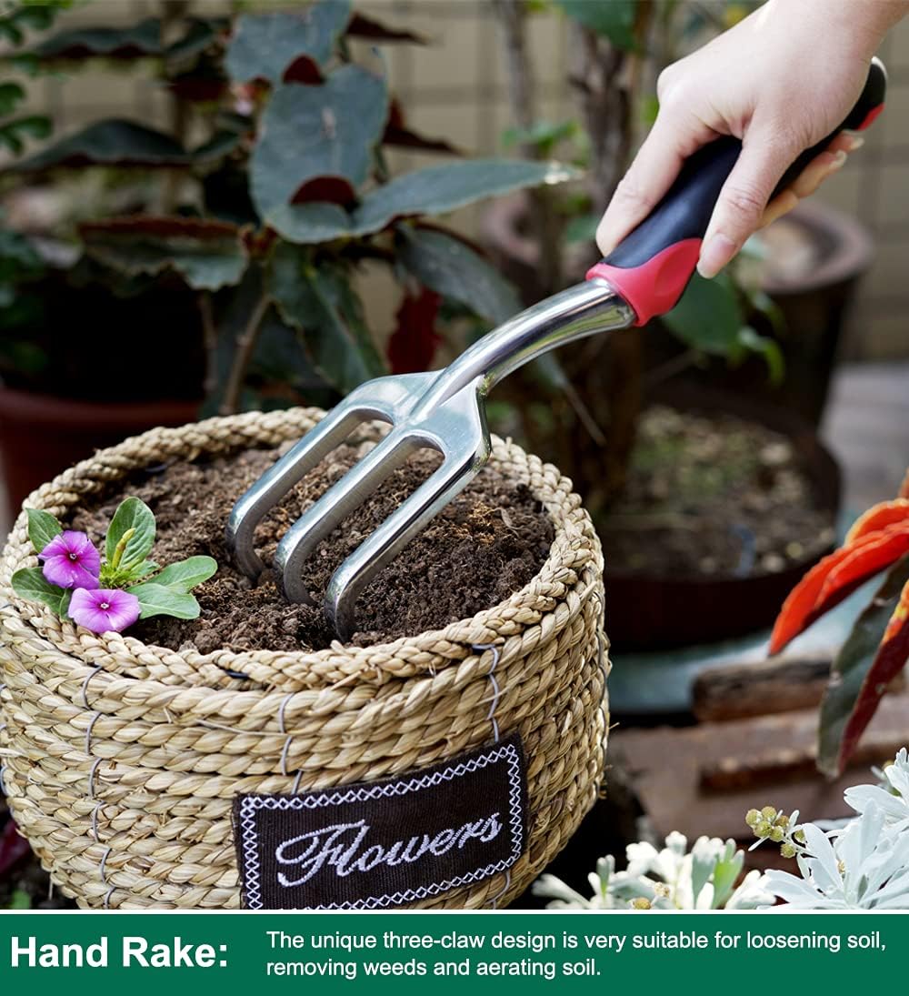 ESOW Garden Tool Set with Non-Slip Rubber Handle, 3 Piece Cast-Aluminum Heavy Duty Gardening Kit Includes Hand Trowel, Transplant Trowel and Cultivator Hand Rake, Red