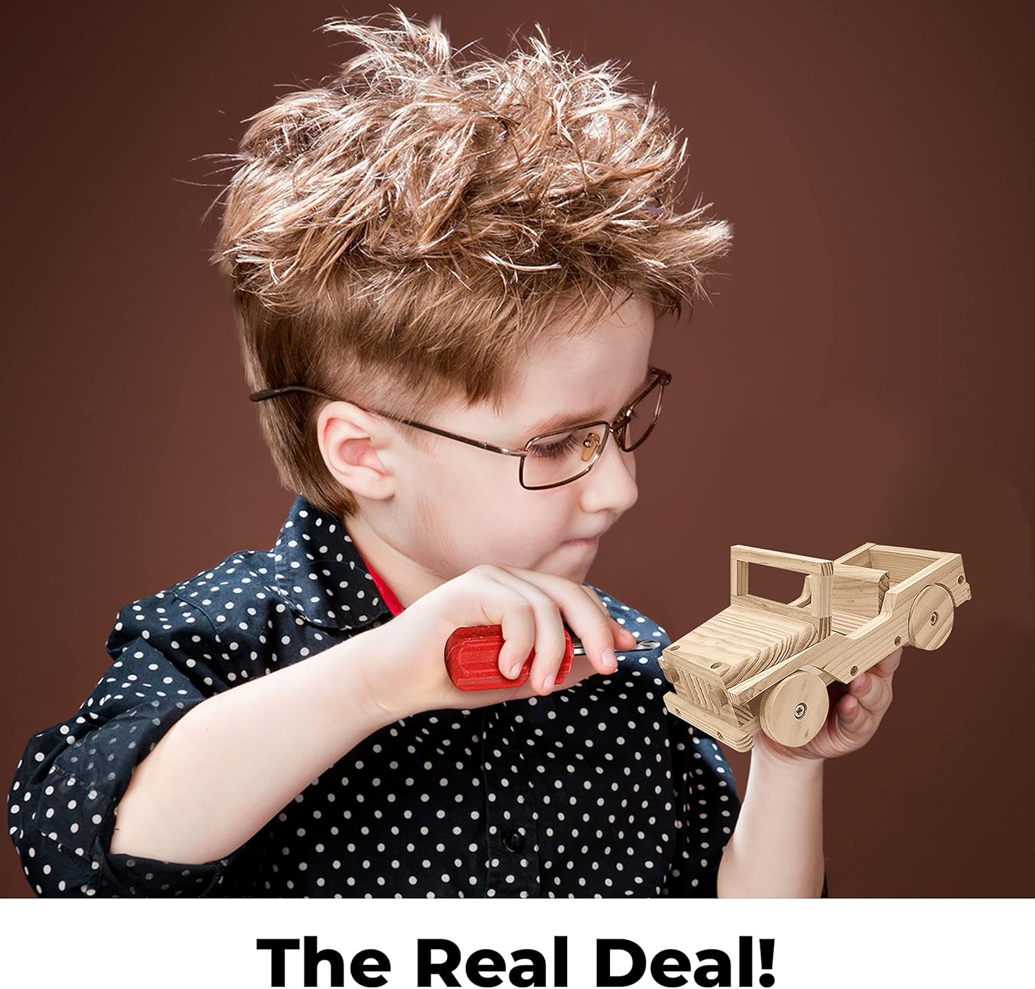 - The Real Deal! Real Wood and Real Tools, Not Just sticking everything together with glue. Wood Pieces are real- not foam or faux wood. Kids will love using the screwdriver and screws to put this together just like adult woodworking!
