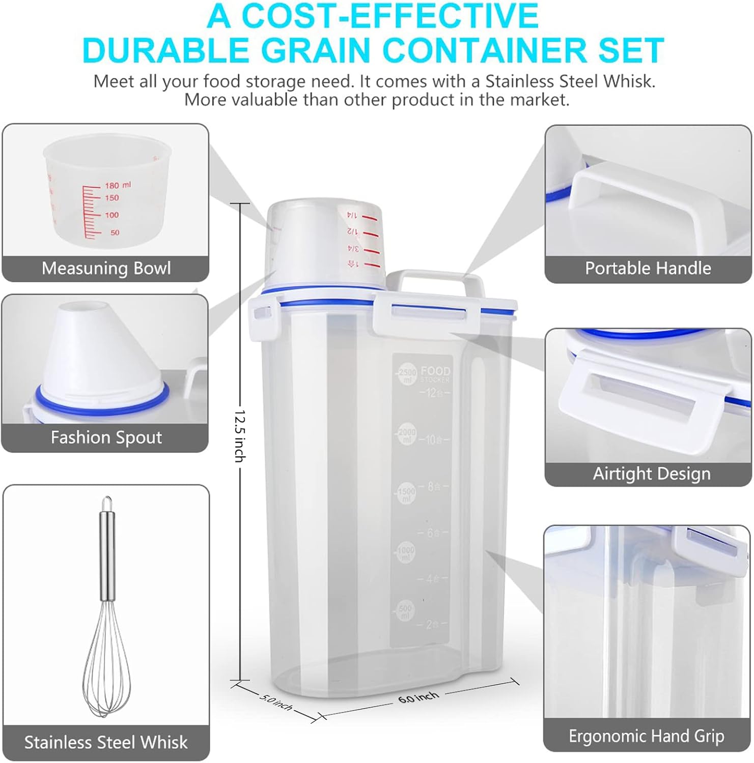 Rice Airtight Dry Food Storage Containers, BPA Free Plastic Sealed Holder Bin Dispenser with Pouring Spout, Measuring Cup for Cereal, Flour and Oatmeal, Include a Stainless Steel Whisk