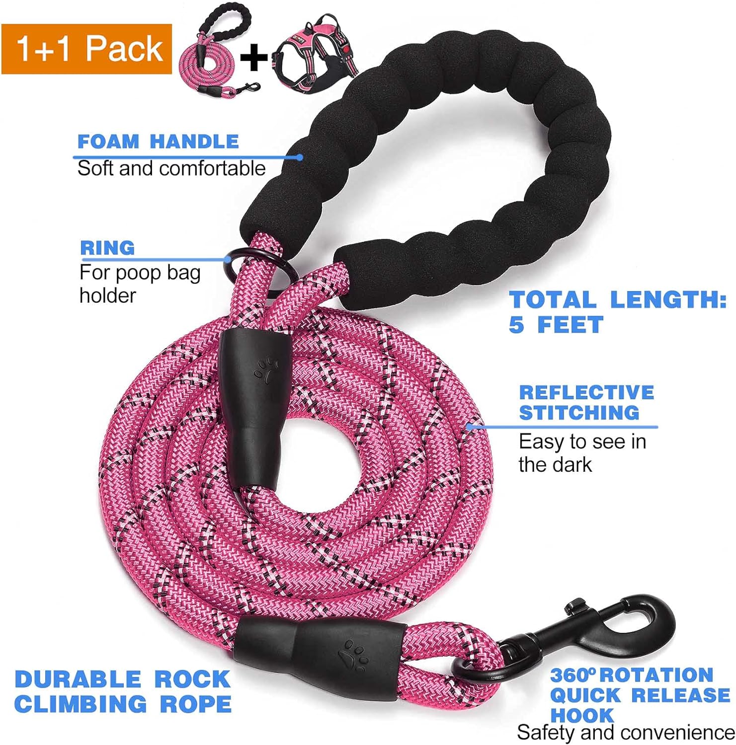 No Pull Dog Harness Adjustable Reflective Oxford Easy Control Medium Large Dog Harness with A Free Heavy Duty 5ft Dog Leash (M (Neck: 14.5"-20.5", Chest: 22"-28"), Pink Harness+Leash)