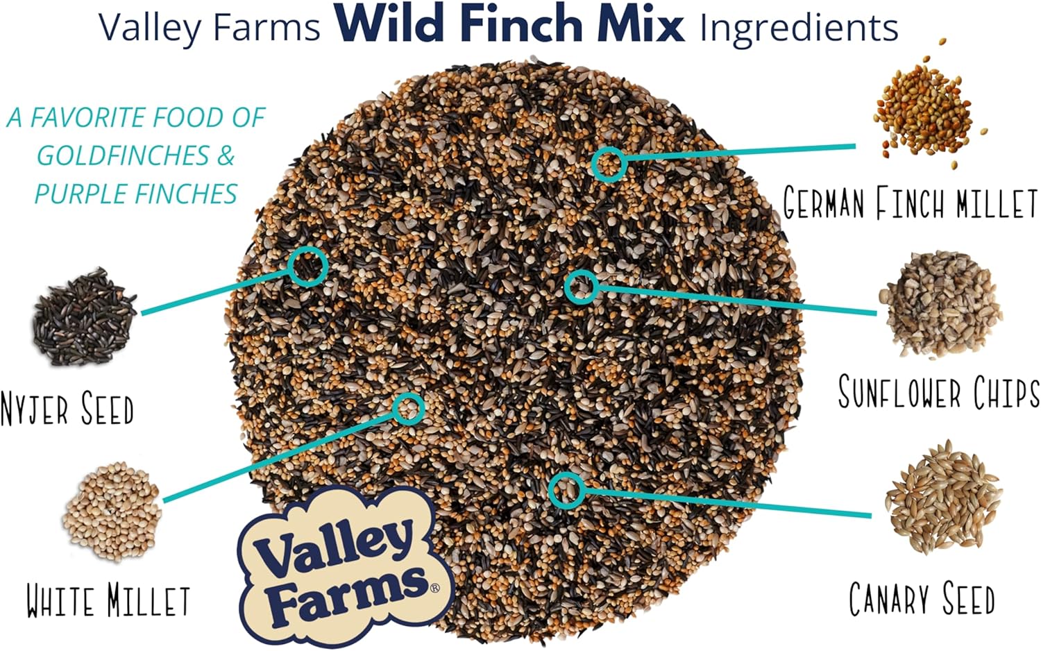 Valley Farms Wild Finch Mix (4 LB) Wild Bird Food for Outside Feeders, Wild Bird Seed with Millet and Chopped Sunflower Hearts for Birds, Finch Seed for Finch Feeders, Sunflower Kernels