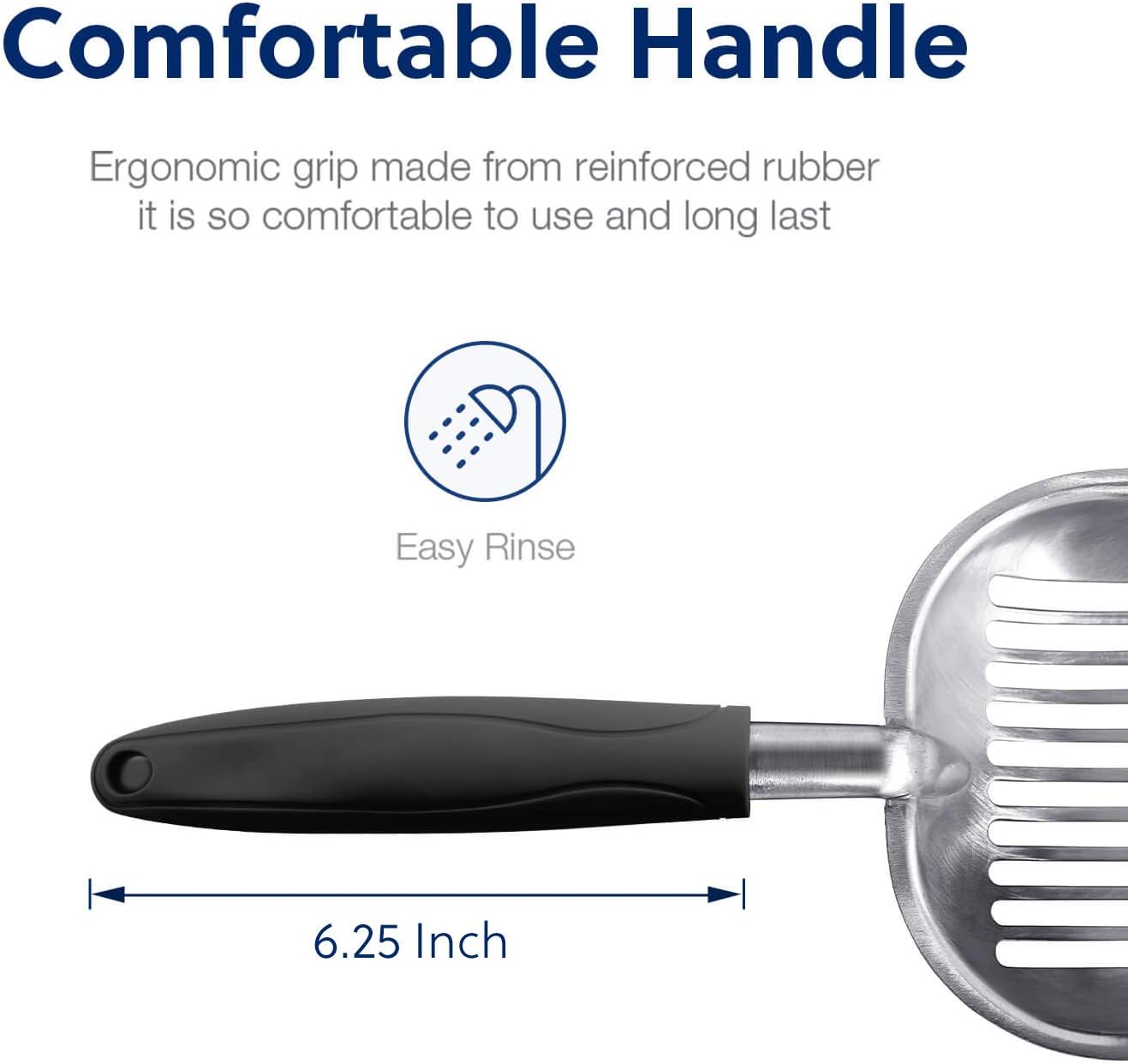- [Features]: WePet made this scooper durable with heavy duty quality. After investigation with thousands thoughtful users, we finally make an improvement of removing the serrated edge as mentioned on reviews. The body is waterproof and very easy to clean, rust-resistant and corrosion resistant. It’s highly recommended by cat lovers for everyday use.