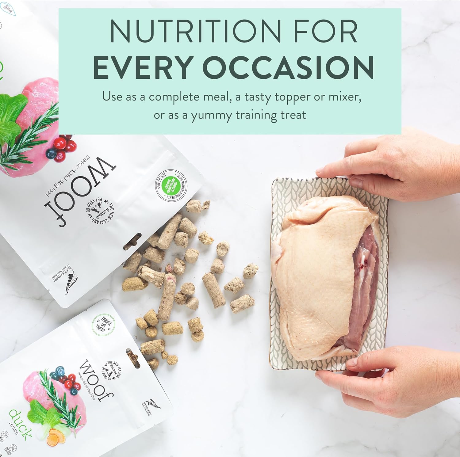 WOOF Duck Freeze Dried Raw Dog Food, Mixer, or Topper, or Treat - High Protein, Natural, Limited Ingredient Recipe 9.9oz