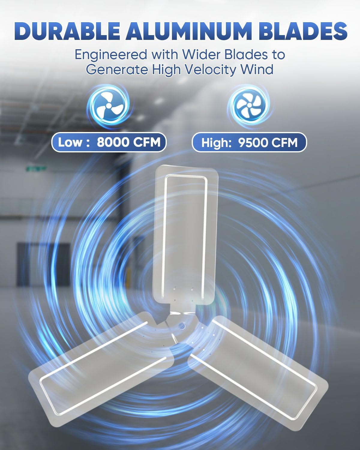 - Superior Airflow Performance. This high-velocity fan delivers up to 7497 CFM on high speed with 2-speed settings. Featuring 90° oscillation and 60° vertical tilt, it ensures efficient cooling and wide air circulation for large spaces.