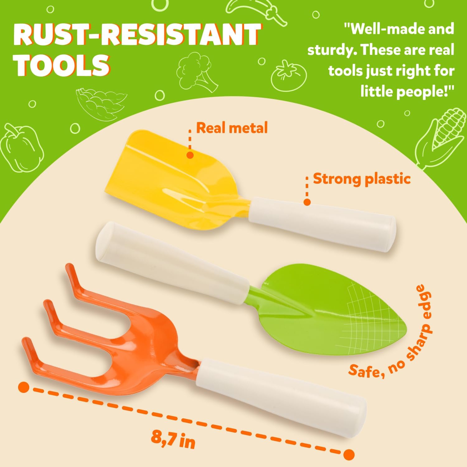 - REAL TOOLS, PERFECT FOR LITTLE HANDS – Unlike flimsy plastic sets, these real metal tools are just the right size for kids! “My 5 and 3-year-old love digging in the dirt just like grown-ups!”