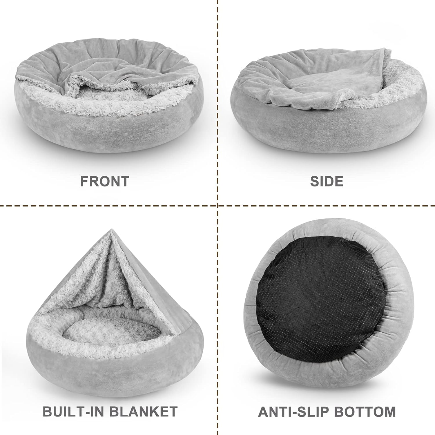 JOEJOY Small Dog Bed Cat Bed with Hooded Blanket, Cozy Cuddler Luxury Puppy Pet Bed, Donut Round Calming Anti-Anxiety Dog Burrow Cave Bed - Anti-Slip Bottom and Machine Washable 23 inch