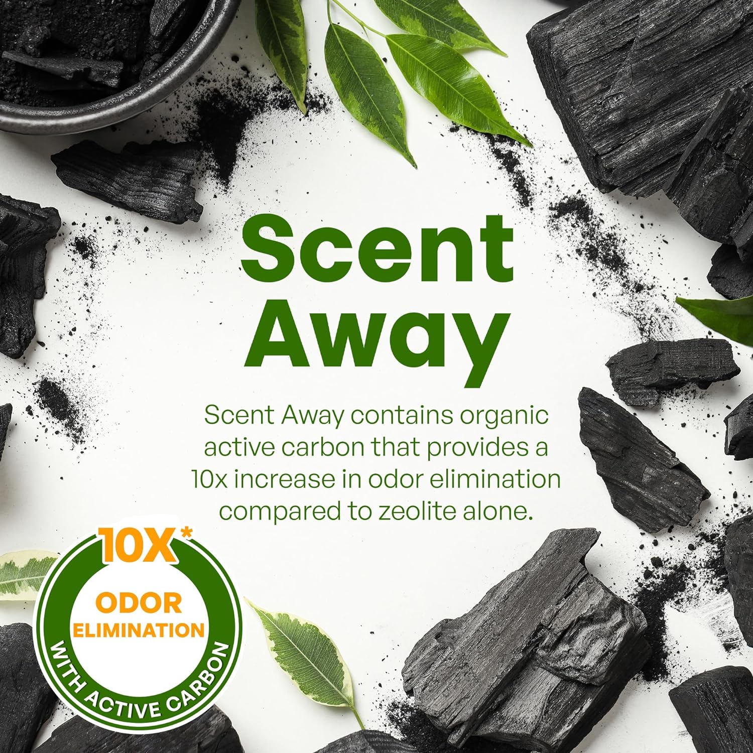 - EXTENDS CAT LITTER LIFE - Not only does Scent Away cat litter deodorizer remove odors from cat litter, it improves moisture holding capacity and extends cat litter life naturally with its active carbon ingredient. It also helps the environment, removing harmful greenhouse gasses from the atmosphere.