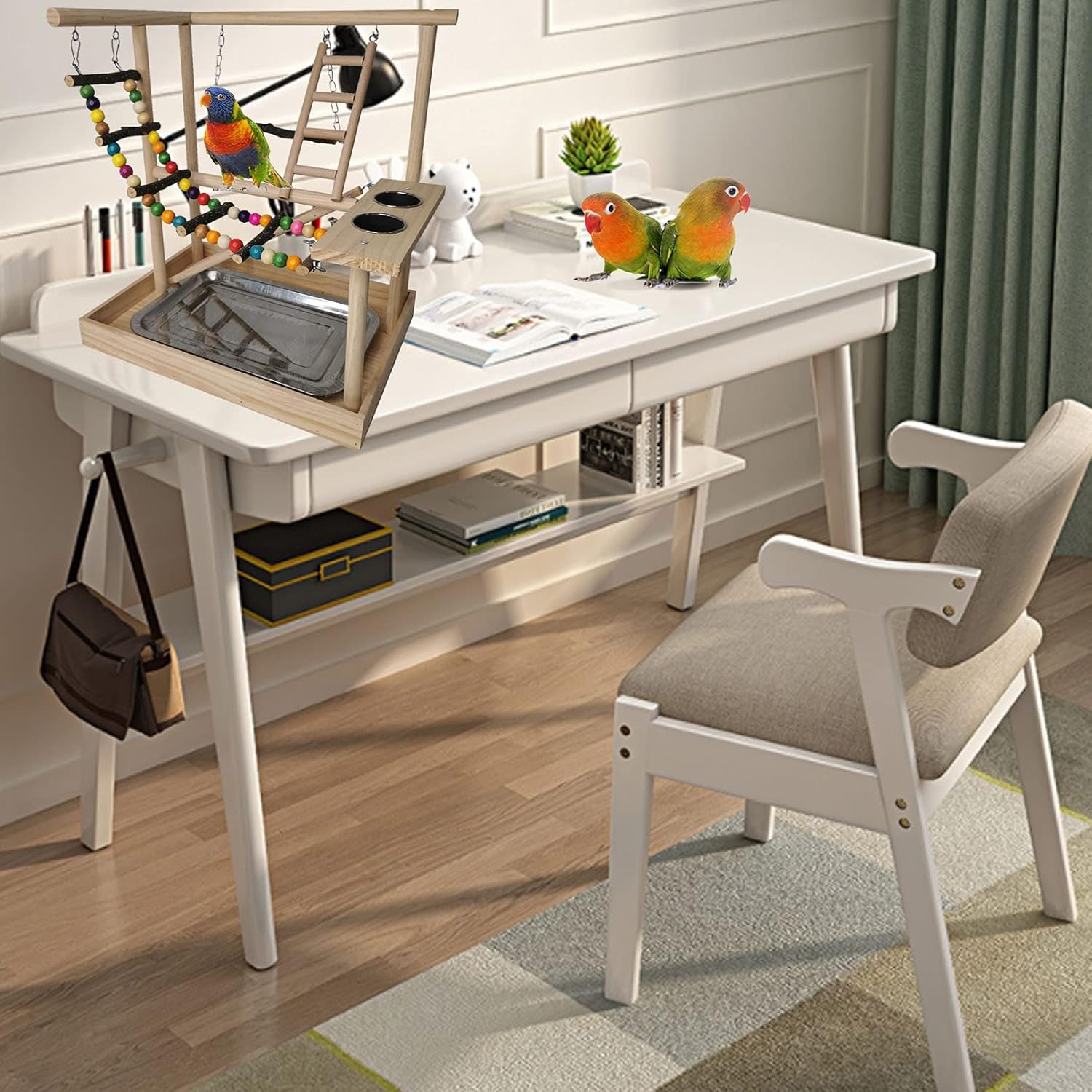 - PERFECT SIZE: The size of Hamiledyi parakeet play stand is 14.5"L x 9.8"W x 15.7"H (37 x 25 x 40 cm), birdcage play stand the great portable size is suitable for placing on the desk. Brightly colored toys appeal to the bird’s strong eyesight capabilities. When kept as pets parrots need time outside of their cage to play, to exercise and to interact with their human companions