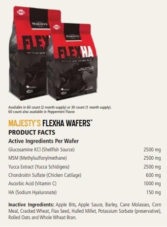 - Contains two (2) bags of Majesty's Peppermint Flex HA Wafers Superior Performance Horse / Equine Joint Support Supplement. Flex HA Wafers are for performance horses, which have combined five superior support supplements plus 150mg of HA to produce a superior, easy-to-use supplement wafer that increases range of motion and reduces inflammation