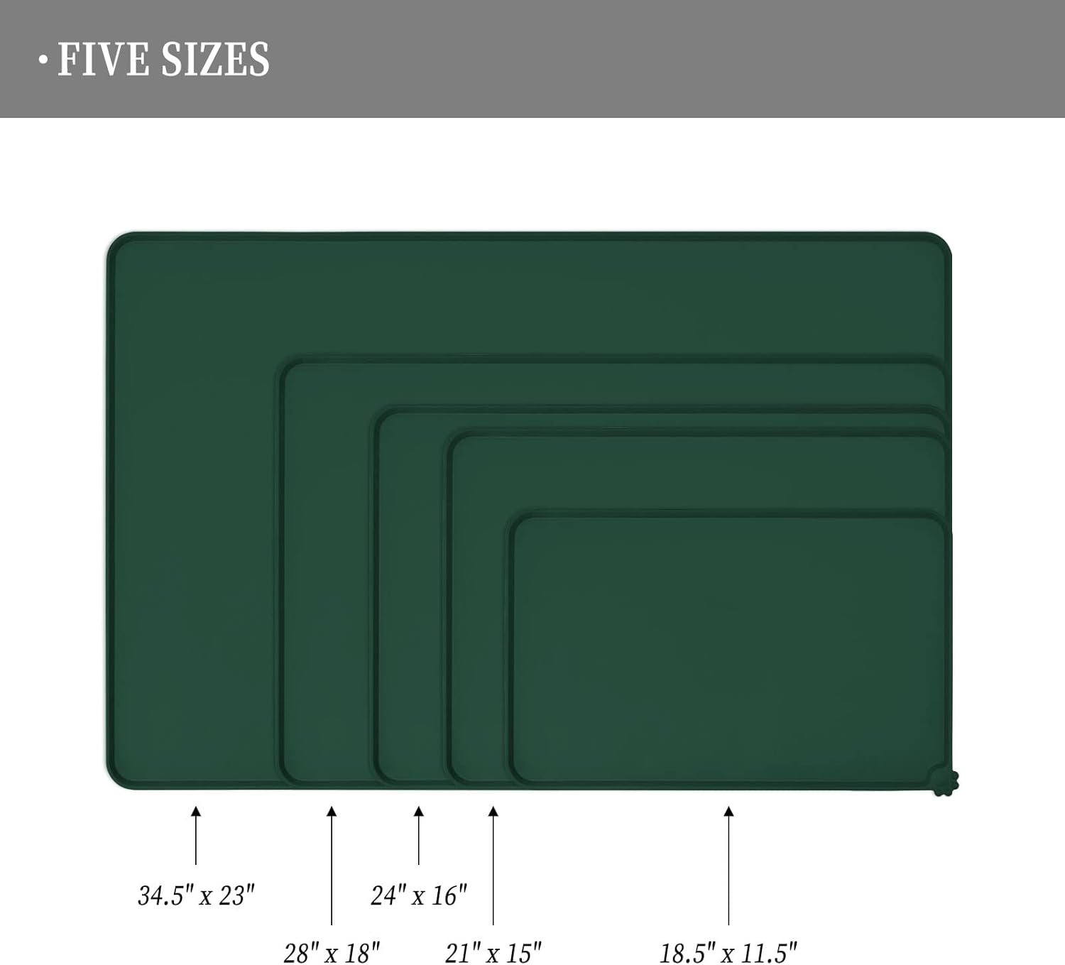 - Various sizes available: our pet mats come in 5 different sizes - 18.5" x 11.5", 22" x 14", 24" x 16", 28" x 18", and 32" x 24". Suitable for all kinds of pets, from puppies to large pets, choose the perfect size for your furry friends and avoid messy spills at mealtime
