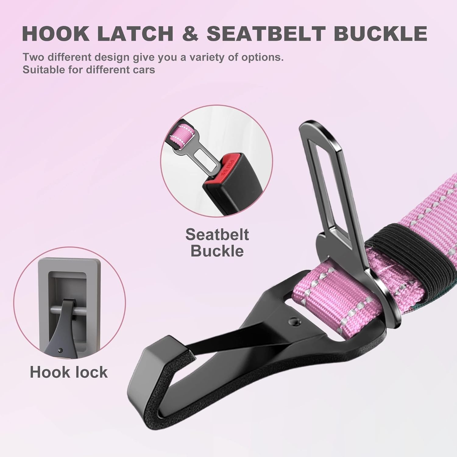IOKHEIRA Dog Seat Belt 3-in-1 Car Harness for Dogs Adjustable Safety Seatbelt for Car Nylon Reflective Bungee Fabric Dog Car Harness with Clip Hook Latch & Buckle, Swivel Zinc Alloy Carabiner (Pink)
