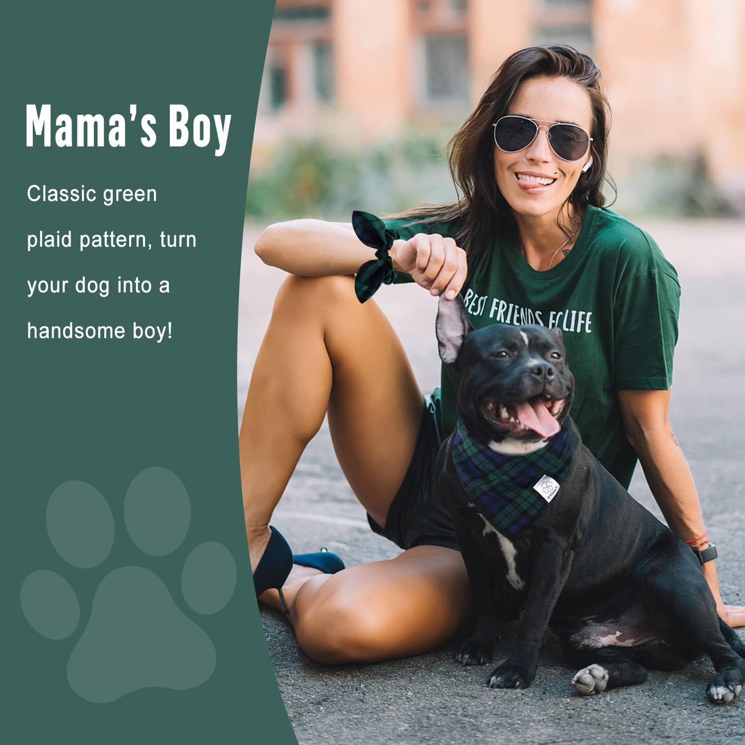 E-Clover Dog Bandanas Boy & Matching Scrunchie Set Plaid Dog Scarf Kerchief for Medium Large Dog Pet Bandana Owner Gifts Blue Green Fall