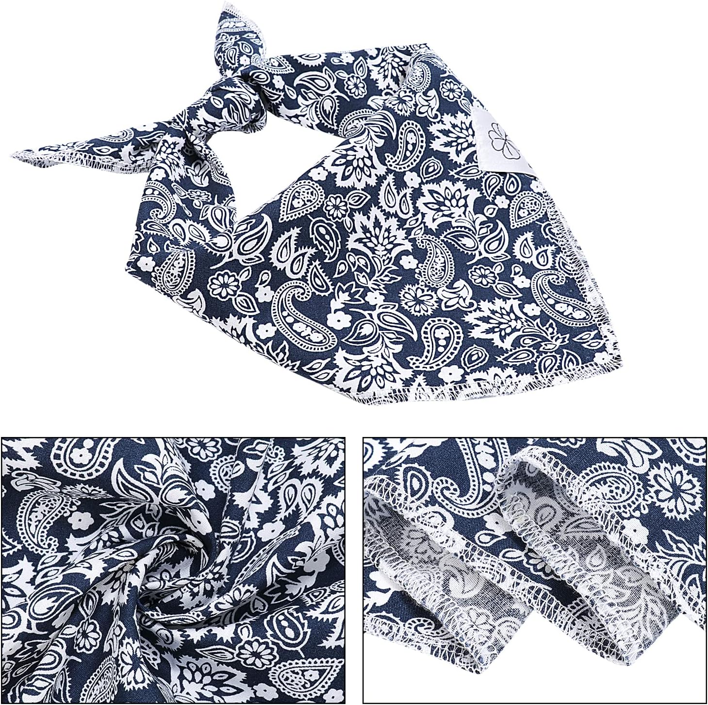 - Cute Dog Bandanas Boy size: 19.3’’x19.3’’ (49cm*49cm). The adjustable dog bandanas girl fit dog neck size up to 21.2’’ (54cm). You can roll the square paisley dog bandana a couple of times to fit your dog & cat if it’s too large for your big pets. Please measure your dog’s neck before buying. Flower bow scrunchie is one size fits all.