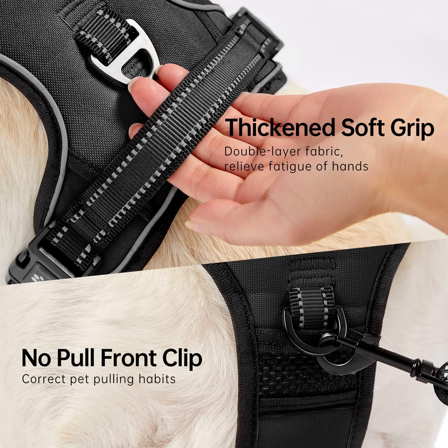 - 【SAFETY DETAILS】 Front and Rear Clip Design - One front clip for pull-free control or dog training and the other rear clip for casual walking or jogging. In addition, the reflective strip design allows your dog to walk freely at night and prevent collisions
