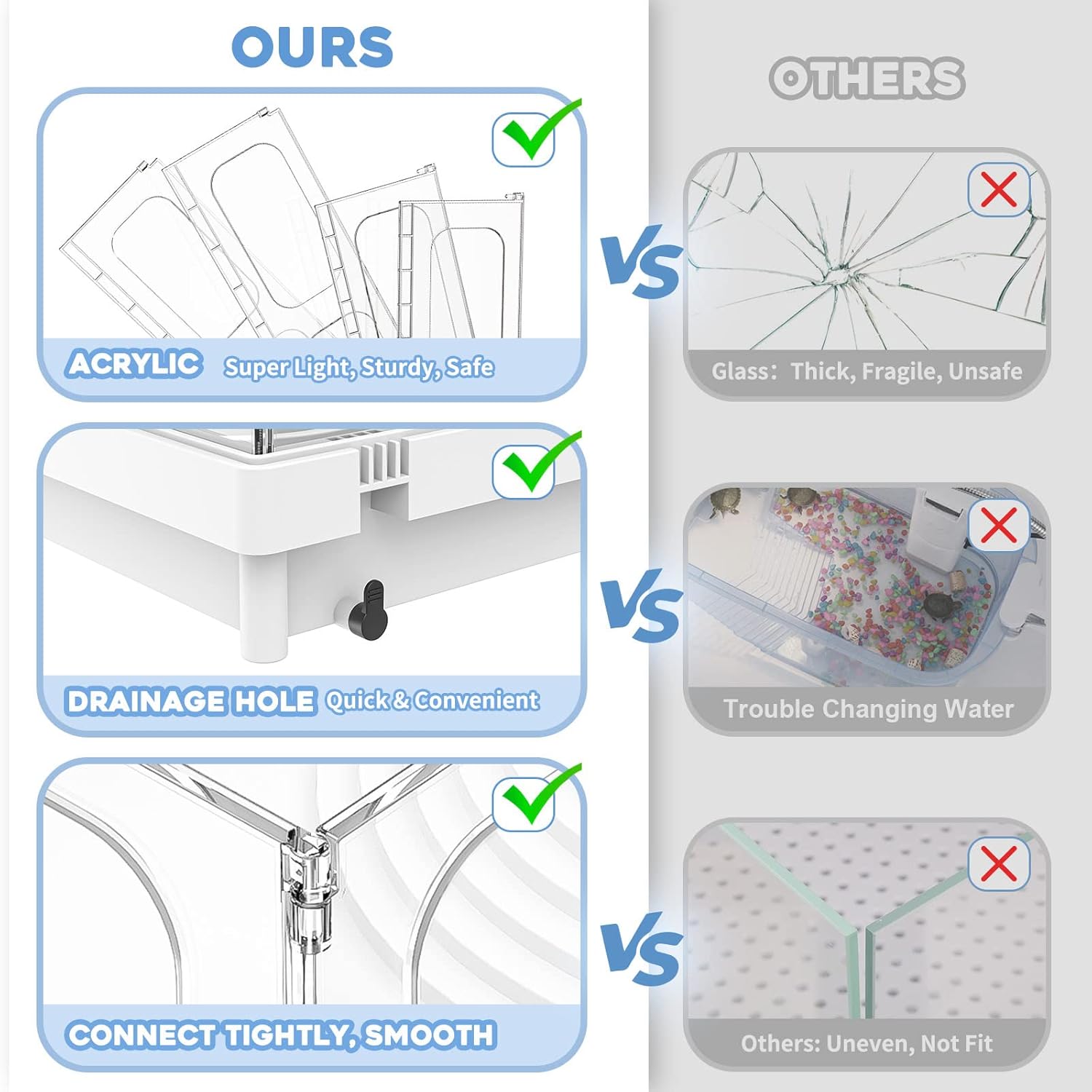 - 【TRANSPARENT DESIGN FOR BETTER VIEWING】Turtle habitat is built with acrylic panels. Acrylic panels are completely transparent. You can enjoy the inside view clearly and watch your pets easily. The panel has a thickness of only 5mm which is much lighter, safer and more durable if compared with those made of glass.