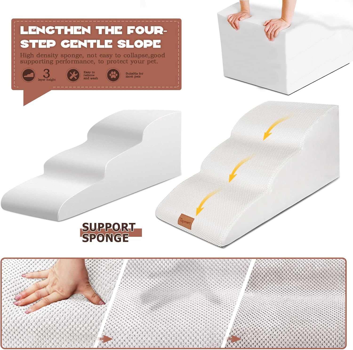 - Upgrade: Compared to the original model, we lengthened each step by 2 inches and each step is larger, increasing the safety of the product while providing a smoother climbing environment for older or leg-injured pets. Cover added waterproof layer to protect the sponge from getting dirty. Even if the pet accidentally pee on the dog ladder, will not leave a mark on the sponge.