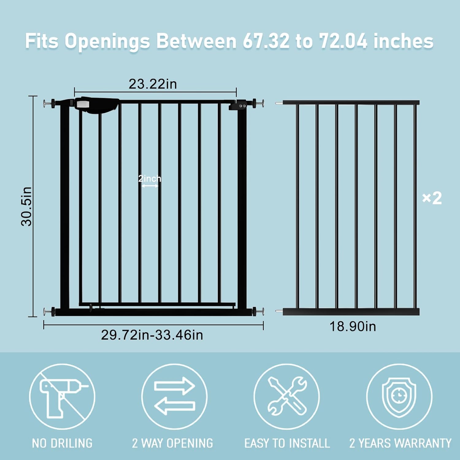 - 【Multi Use】The width of the triple lock extra wide pressure mounted baby gate can be adjusted from 25.59 inches to 81.49 inches so that it is available for stairs, doorways, and other diverse occasions to stop babies or pets to climb over. Tips: before installation, there will be a gap between the wide gate latch and the frame which is NOT a defect and it is NOT bent. This gap will disappear once installed.