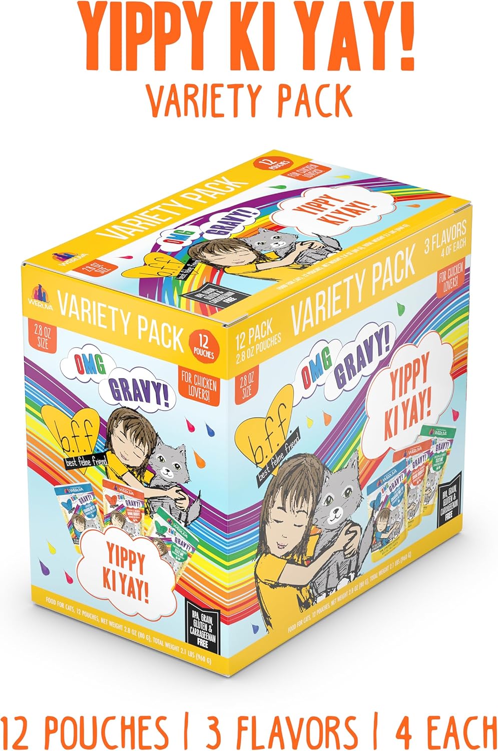 Weruva B.F.F. OMG - Best Feline Friend Oh My Gravy!, Yippy Ki Yay Yellows! Variety Pack, 2.8oz Pouch (Pack of 12)