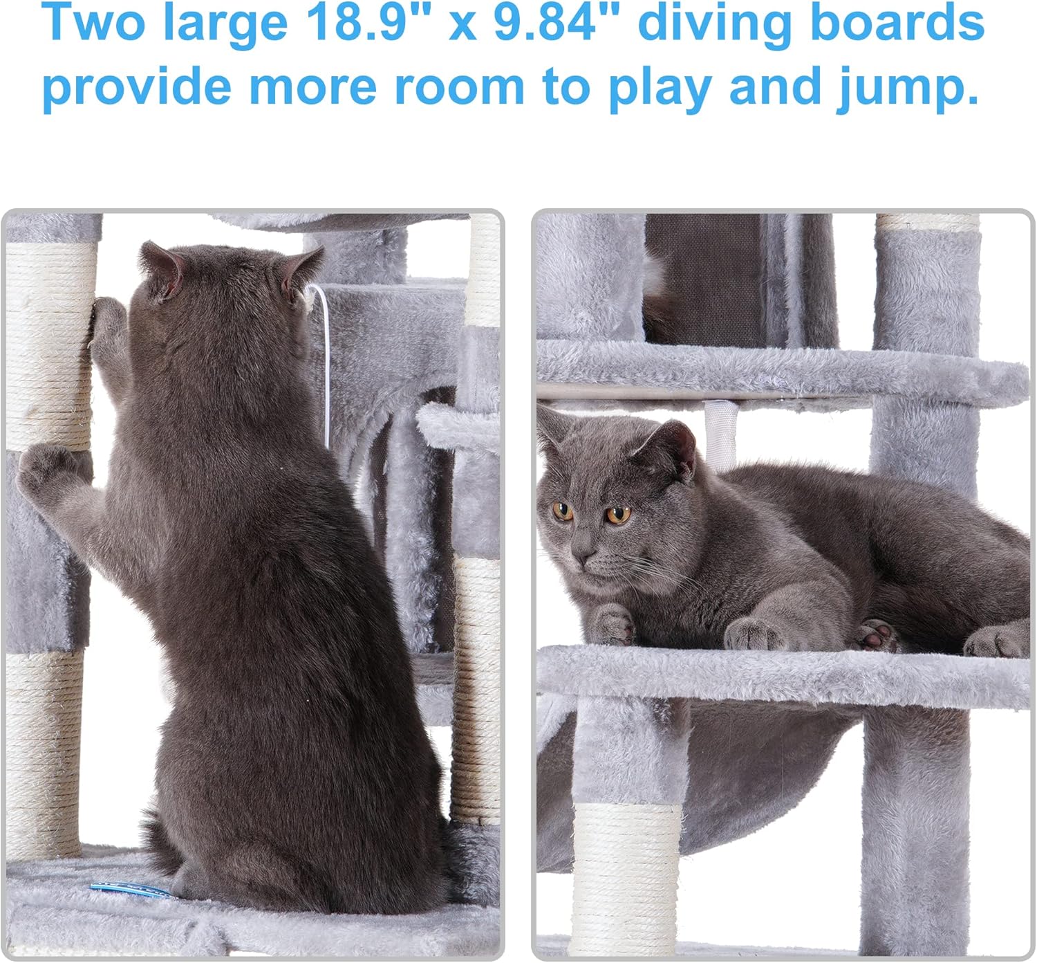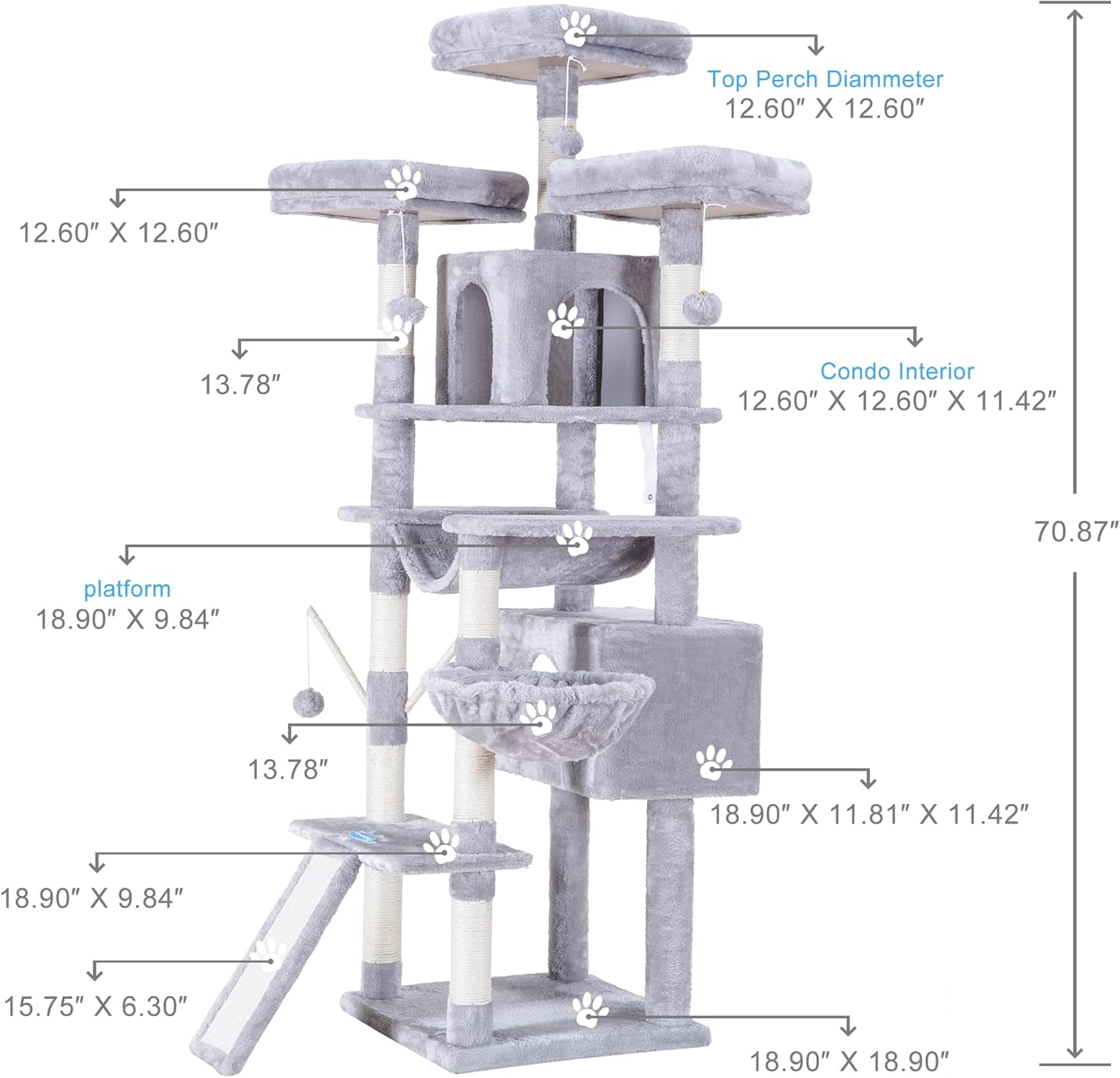 Hey-brother Cat Tree, 71 inches XL Large Cat Tower for Indoor Cats, Multi-Level Cat House with 3 Padded Perches, Big Scratcher, Cozy Basket, 2 Cat Condos and Scratching Posts, Light Gray MPJ034W