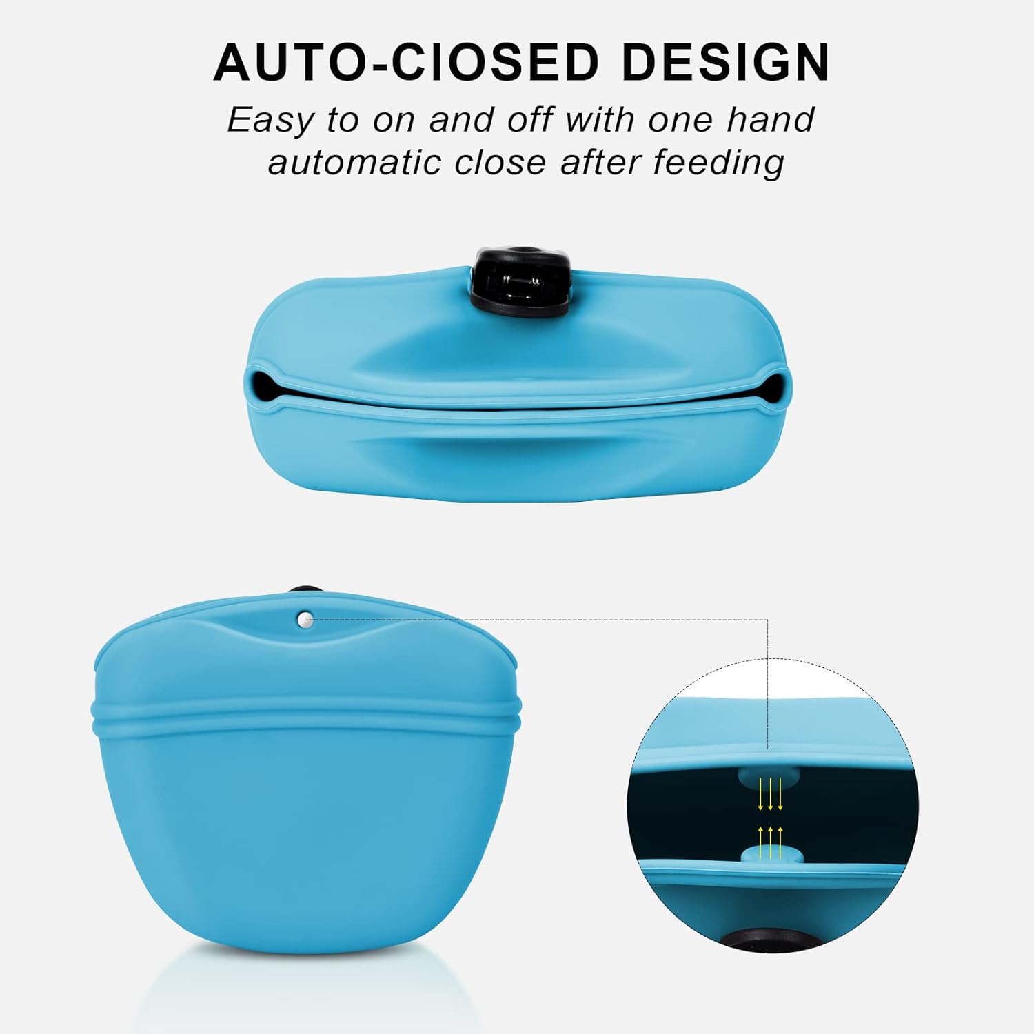 - ๐Silicone Dog Treat Pouch๐ - The silicone dog treat pouch is made of food grade silicone,it can contact dry and wet food directly,safe and healthy. Itโs easy to on and off with one hand, automatic close after feeding.With upgrated clip,It is easy to carry,not easy to fall off.Dish washer safe and easy to clean,The large opening design and soft silicone material make the pet pouch easy to reverse to clean the inner easily and thoroughly.