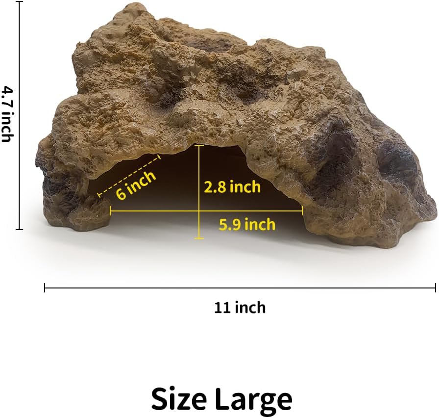 - The Large Size Cave has a suitable entrance with 5.9 inch wide and 2.8 inch height. The interior is spacious enough and smooth, creates a better natural environment for small and medium reptiles like corn snakes, juvenile bearded dragon, leopard gecko, box turtles.