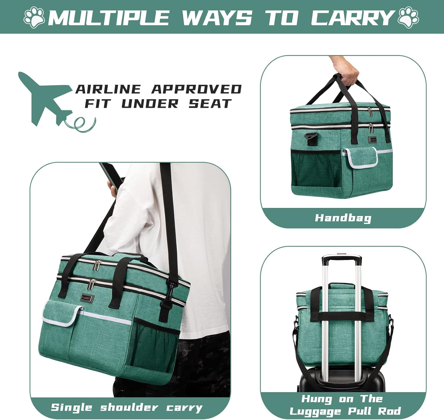BAGLHER Dog Travel Bag for Supplies - Double-Layer Airline Approved Weekend Pet Travel Organizer Set for Dog and Cat Tote with 2 Pet Food Containers and 2 Collapsible Silicone Bowls Green