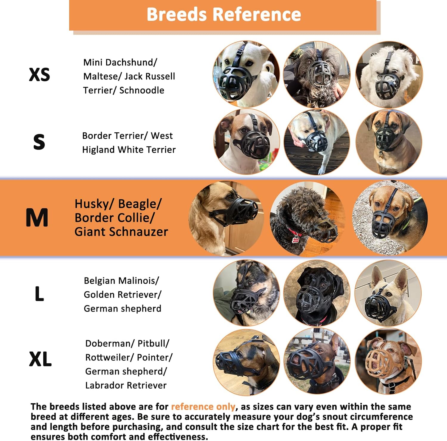 - Perfect Fit for Medium Sized Dog: This option Size M basket muzzle is ideal for medium breeds like Husky and Beagle. The breeds listed above are for REFERENCE only. Be sure to measure your dog’s snout circumference and length accurately before purchasing, and refer to the size chart. A proper fit ensures comfort and effectiveness