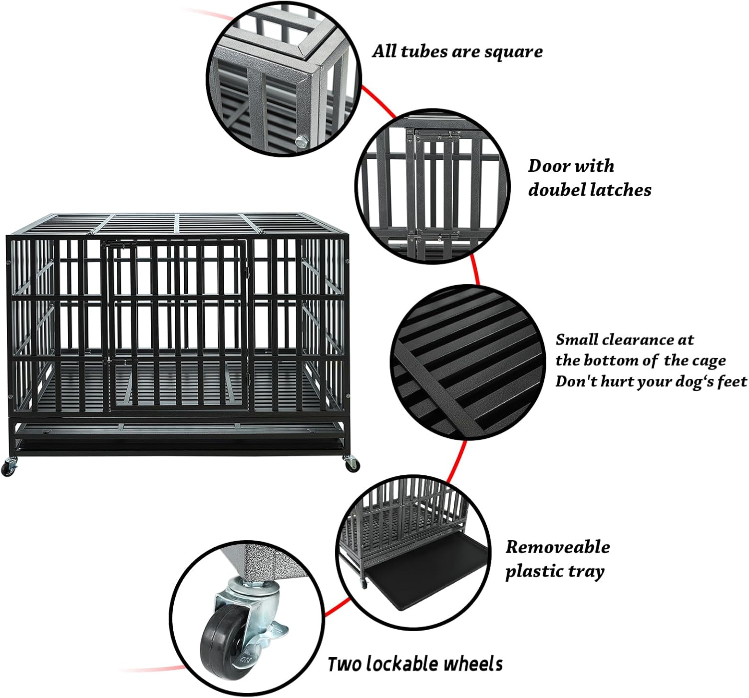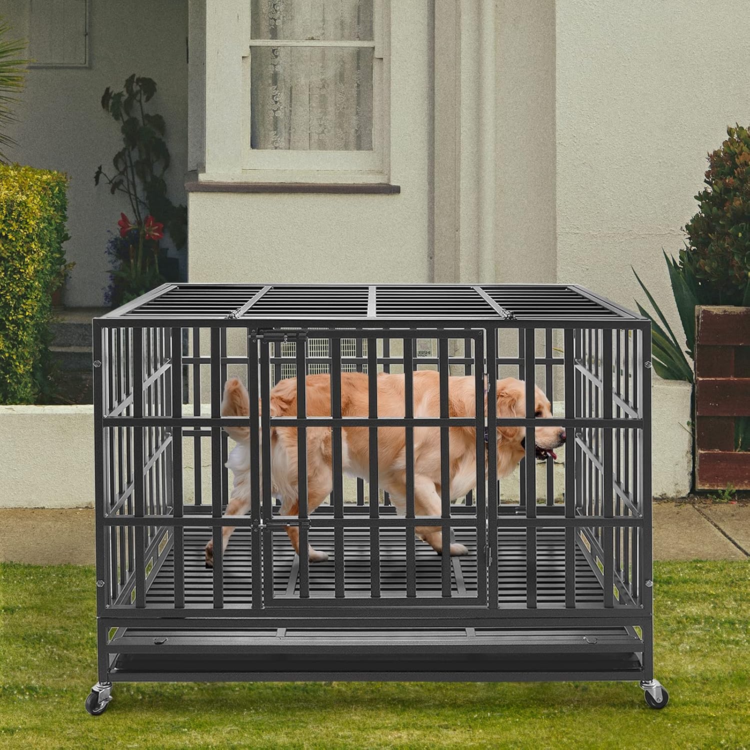 - Non-toxic: Our heavy duty dog crates Made out of STEEL and having all parts welded which means our heavy duty dog cage can prevent even the most aggressive canines from escaping. Sturdy metal frame provides optimal ventilation and visibility which offer your dog a comfortable and reliable environment. It is suitable for indoor and outdoor use.Safe and non-hazardous dog cages protect your pet's health, so you don't have to worry when it chews and licks.