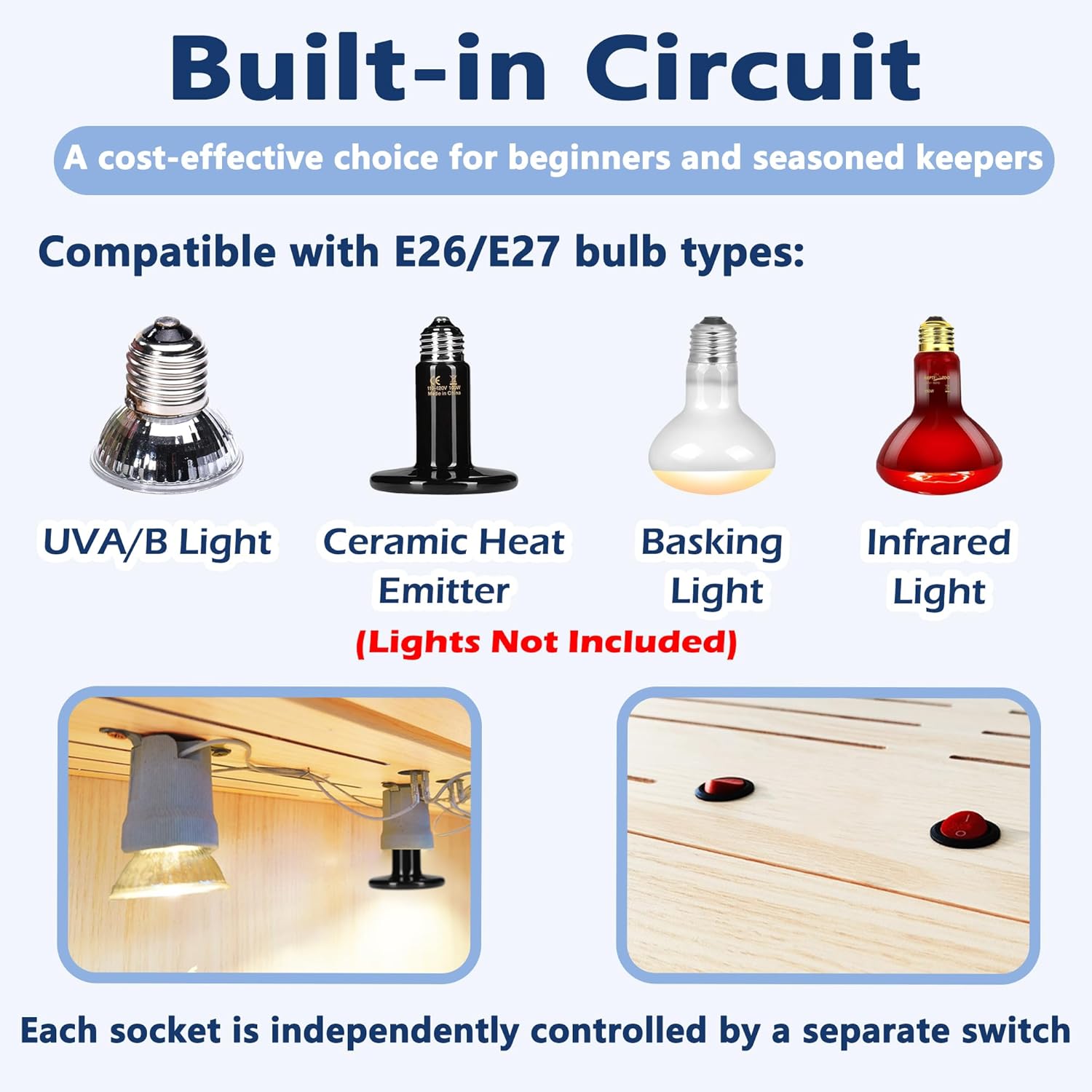 - 【Built-in Bulb Sockets】Featuring two built-in bulb sockets (three in the 40&48-inch version) compatible with E27 heat bulbs, night lights, and more (bulbs not included). Easily set up your lighting for the perfect reptile habitat.