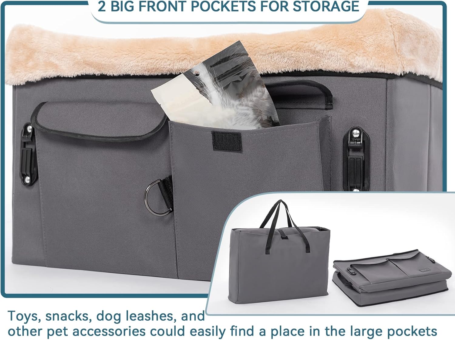 - [Easy to use] Easy to store when not in use thanks to the collapsible design, sturdy construction, and quick installation and removal in the backseat of a car. There are 2 storage pockets that can transport the daily needs of a pet. Additionally, the dog car seat has an adjustable buckle design which is suitable for a variety of car types and can be quickly installed on most standard car seats.