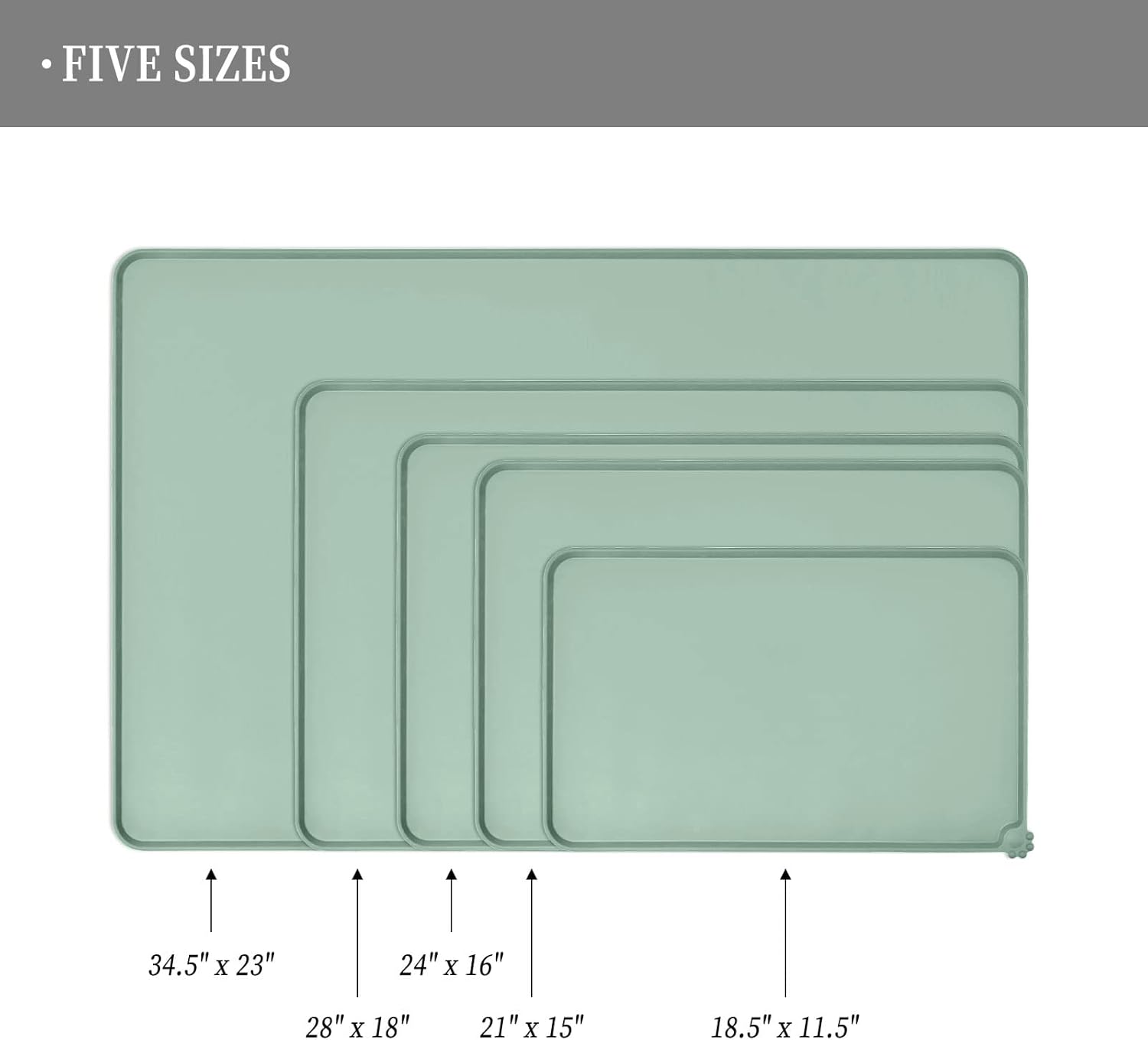 - Various sizes available: our pet mats come in 5 different sizes - 18.5" x 11.5", 22" x 14", 24" x 16", 28" x 18", and 32" x 24". Suitable for all kinds of pets, from puppies to large pets, choose the perfect size for your furry friends and avoid messy spills at mealtime