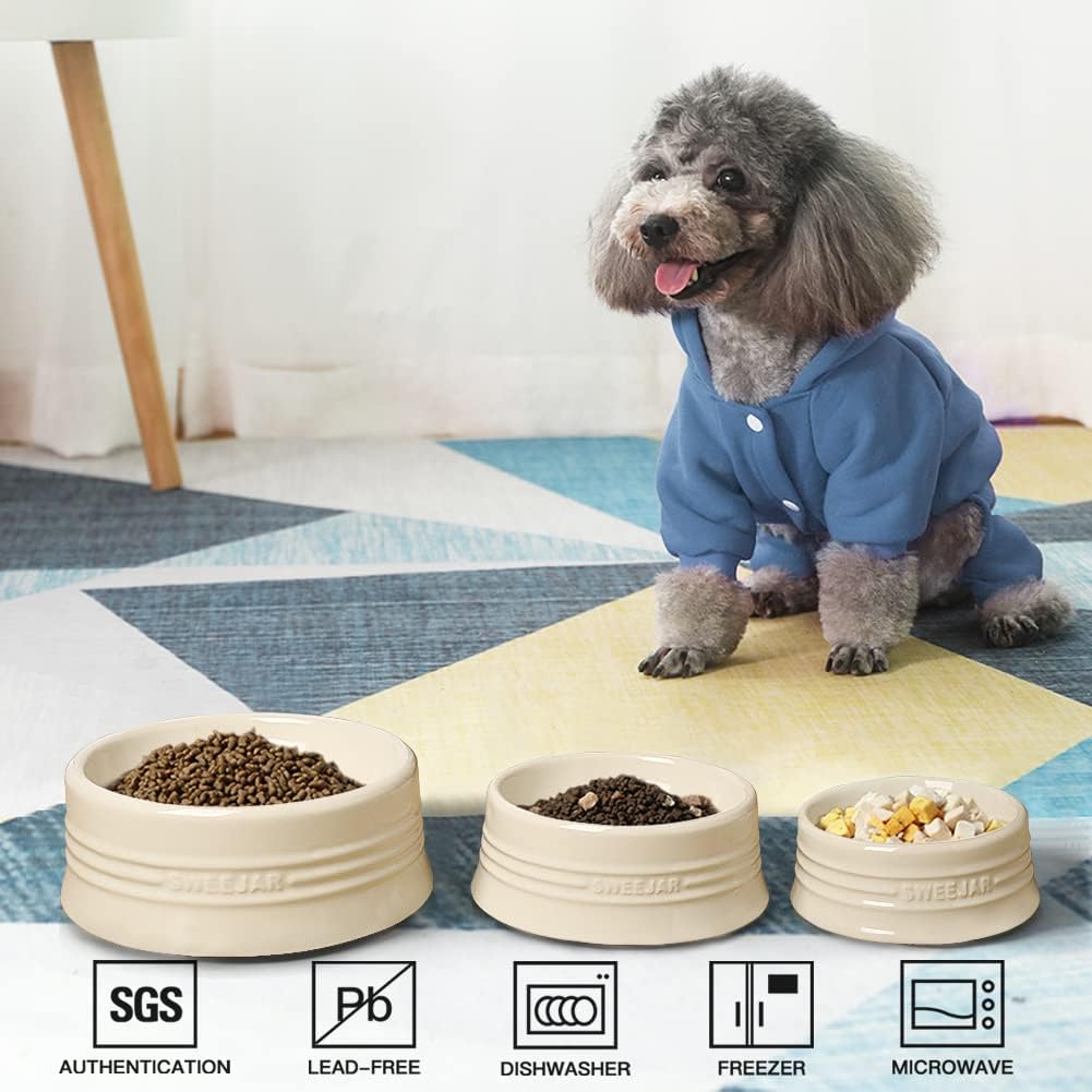 - Non Skidding - SWEEJAR dog bowls are made of food grade porcelain, microwave & dishwasher safe, easy to clean. The ceramic is heavy to help keep the bowl upright when dog eat food. No messy floors to clean.