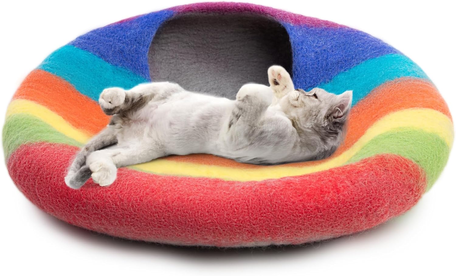 Woolygon Premium Felt Cat Cave Bed โ Wool Kitty Beds Handcrafted Kitten Caves Bed for Indoor Cats - Made from 100% Eco-Friendly Merino Wool, Foldable Cat Hidewawy Covered Cat House Pod (Rainbow Twist)