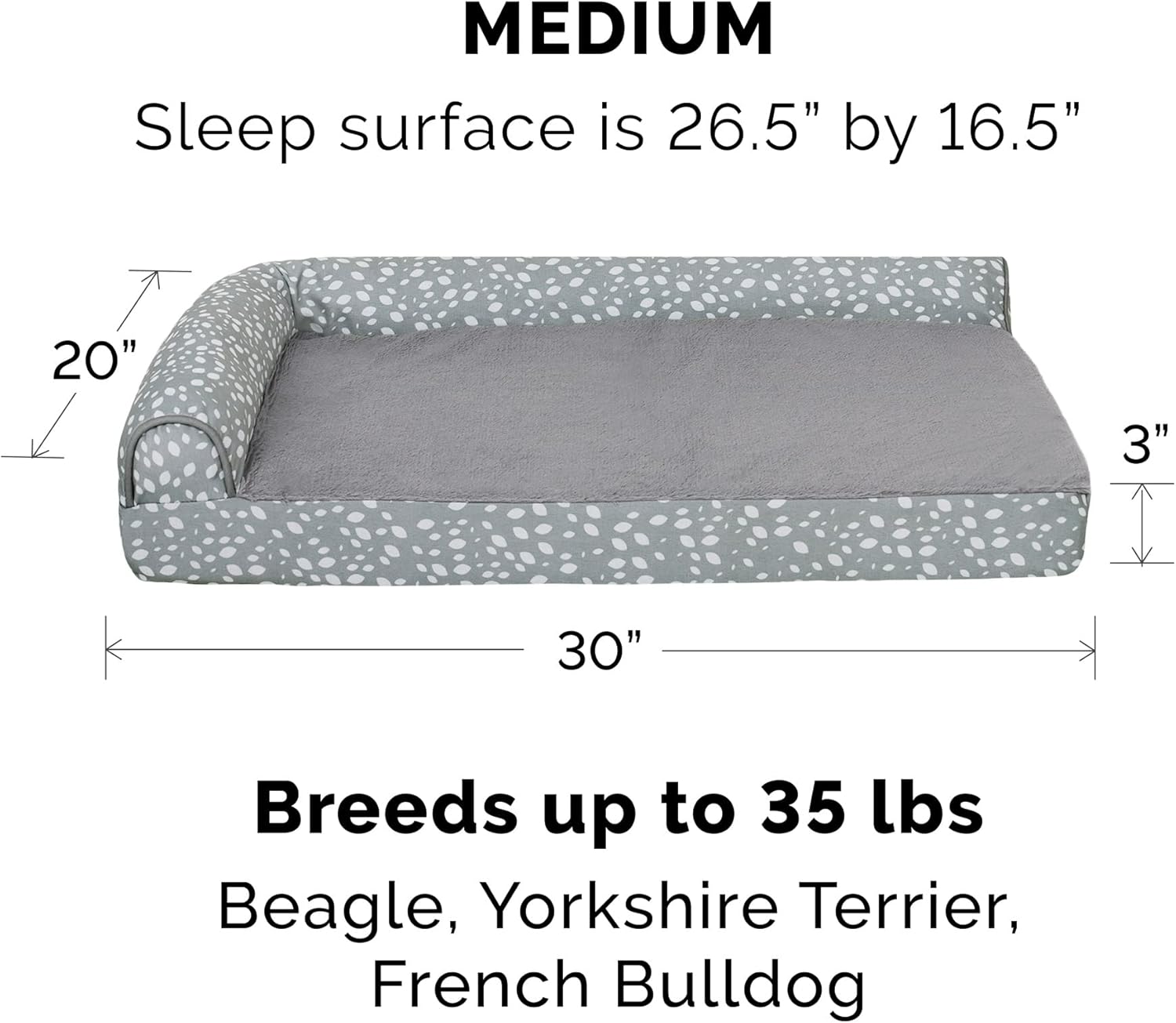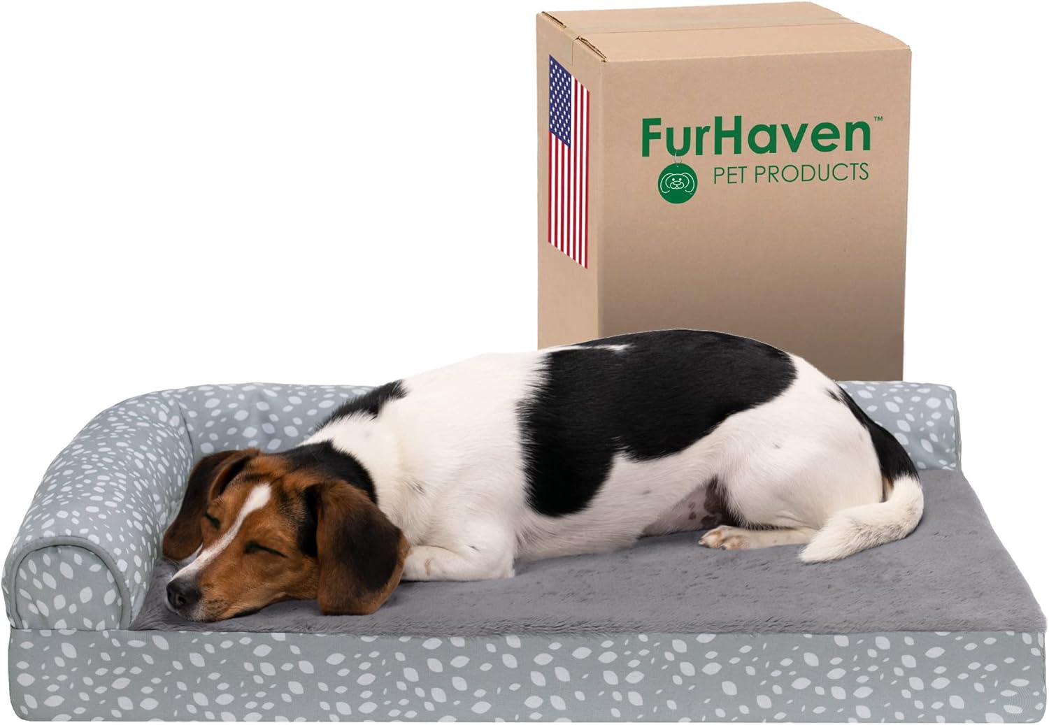 FurHaven Supportive Cooling Memory Foam L Chaise Dog Bed with Washable & Removable Cover - Plush & Almond Print - Gray Almonds, Dogs Up to 35 lbs - Medium