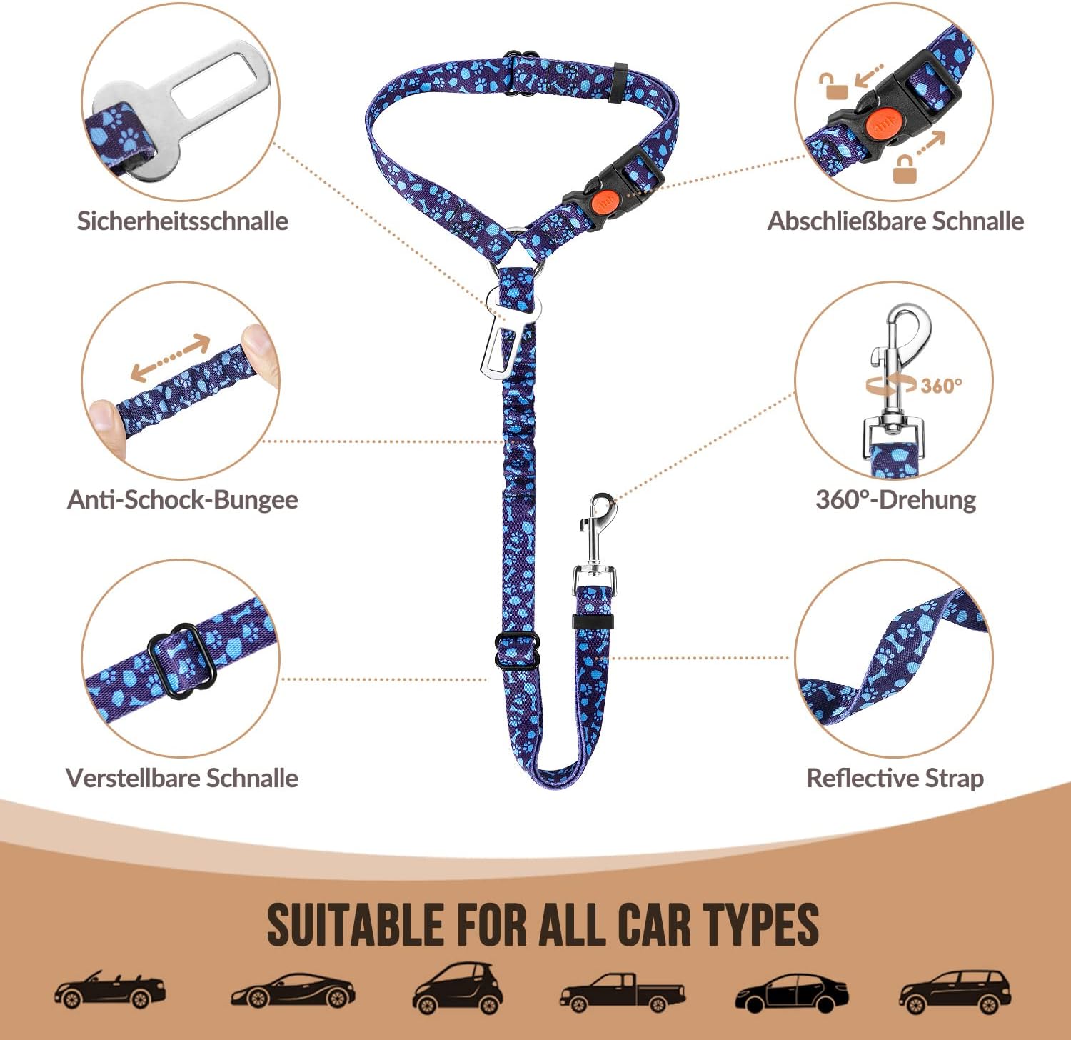 - Keeping Safe and Comfortable --- The dog seat belt helps to ensure the safety of your pet and prevent you from distracting when driving. It allows your dog to sit, stand, lie down comfortably or reach to see out the window but keep the dogs from jumping around in the car. Easily to fasten it onto the dog harness via the 360 degree rotation metal buckle.