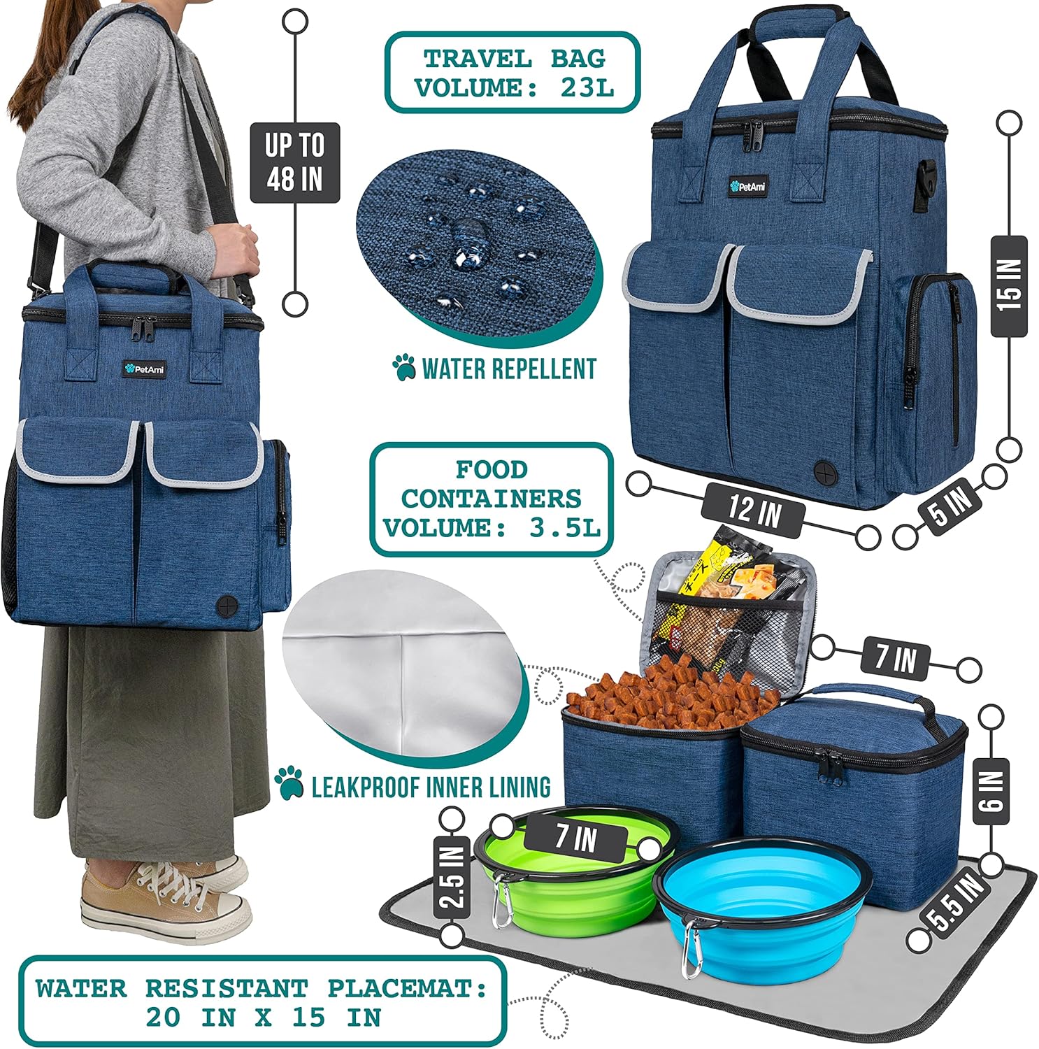 PetAmi Dog Travel Bag Pet Supplies Accessories Organizer for Traveling, Camping, Weekend; Cat Pet Travel Bag Kit Includes 2 Food Storage Containers, 2 Collapsible Bowls, 1 Feeding Mat (Navy Blue)