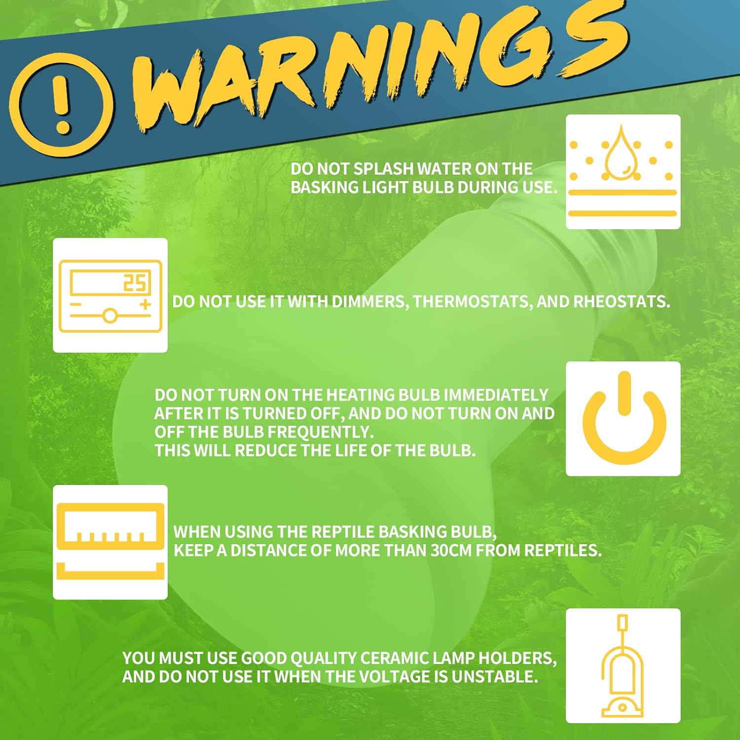 - ๐ฆSafety Instructions - You must use good quality ceramic lamp holders, and do not use it when the voltage is unstable. Do not use it with dimmers, thermostats, and rheostats. Do not splash water on the basking light bulb during use. When using the reptile basking bulb, keep a distance of more than 30cm from reptiles. Do not turn on the heat bulb immediately after turning it off, and do not turn the bulb on and off frequently.