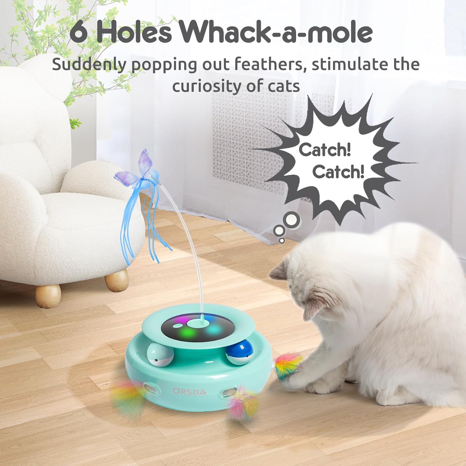 - ๐[3-In-1, Catsโ 3 Favorite Games] ORSDA Indoor Cat Interactive Cat Toy is designed to stimulate your catโs natural instincts: chase, pounce, ambush. The spinning ball stimulates your cat's senses. Randomly popping feathers stimulate the hunting instinct. Swirling butterflies encourage chasing. All of this will keep your cat happy and burn off their energy!